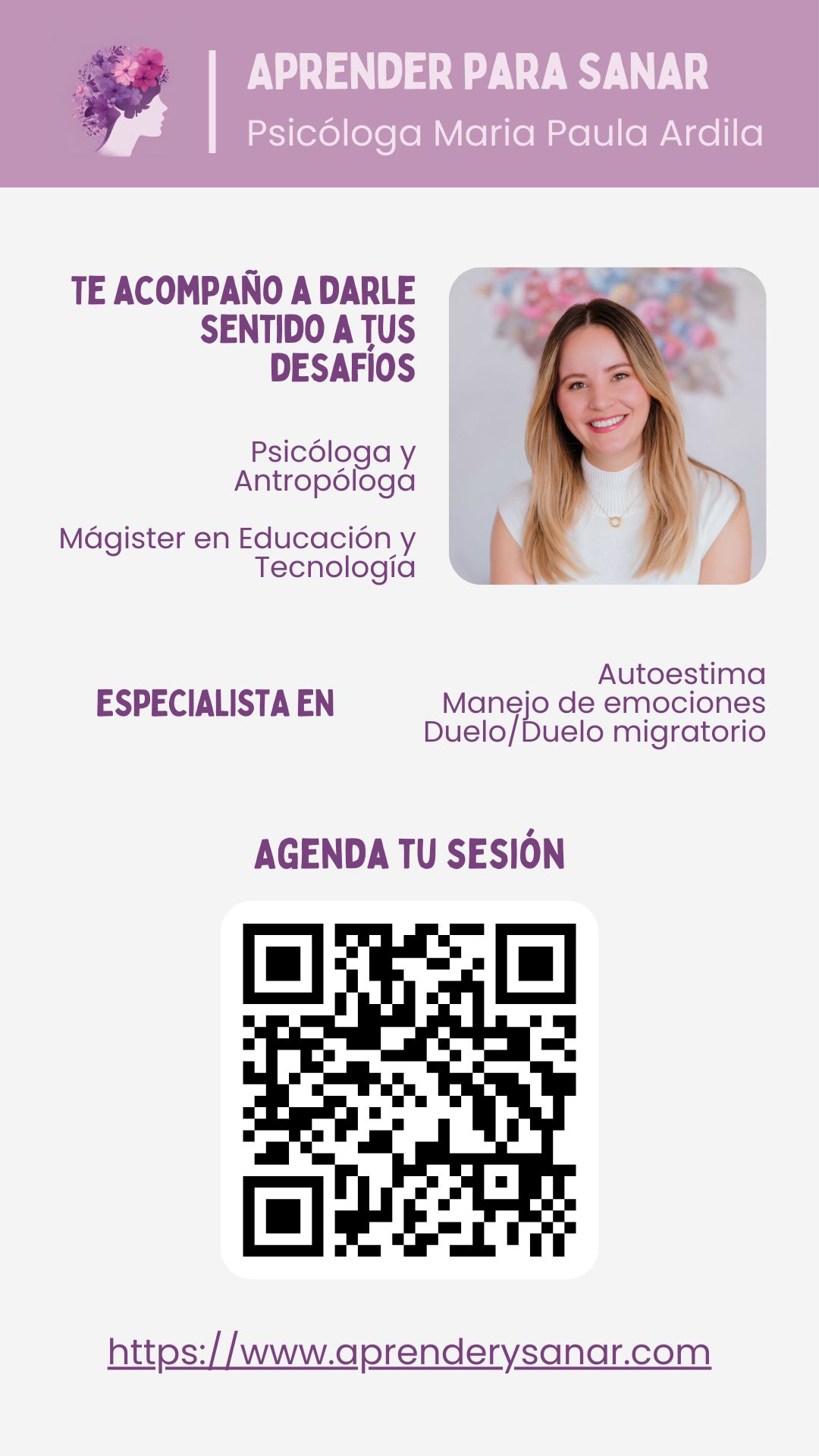 Soy psicóloga y antropóloga con maestría en educación y tecnología. Combino la psicoterapia individual con herramientas digitales y educativas para ayudarte a resignificar emociones, gestionar procesos como el duelo migratorio y mejorar tus relaciones interpersonales. Mi propósito es acompañarte con enfoque humano y práctico sin importar en qué lugar del mundo estés.
