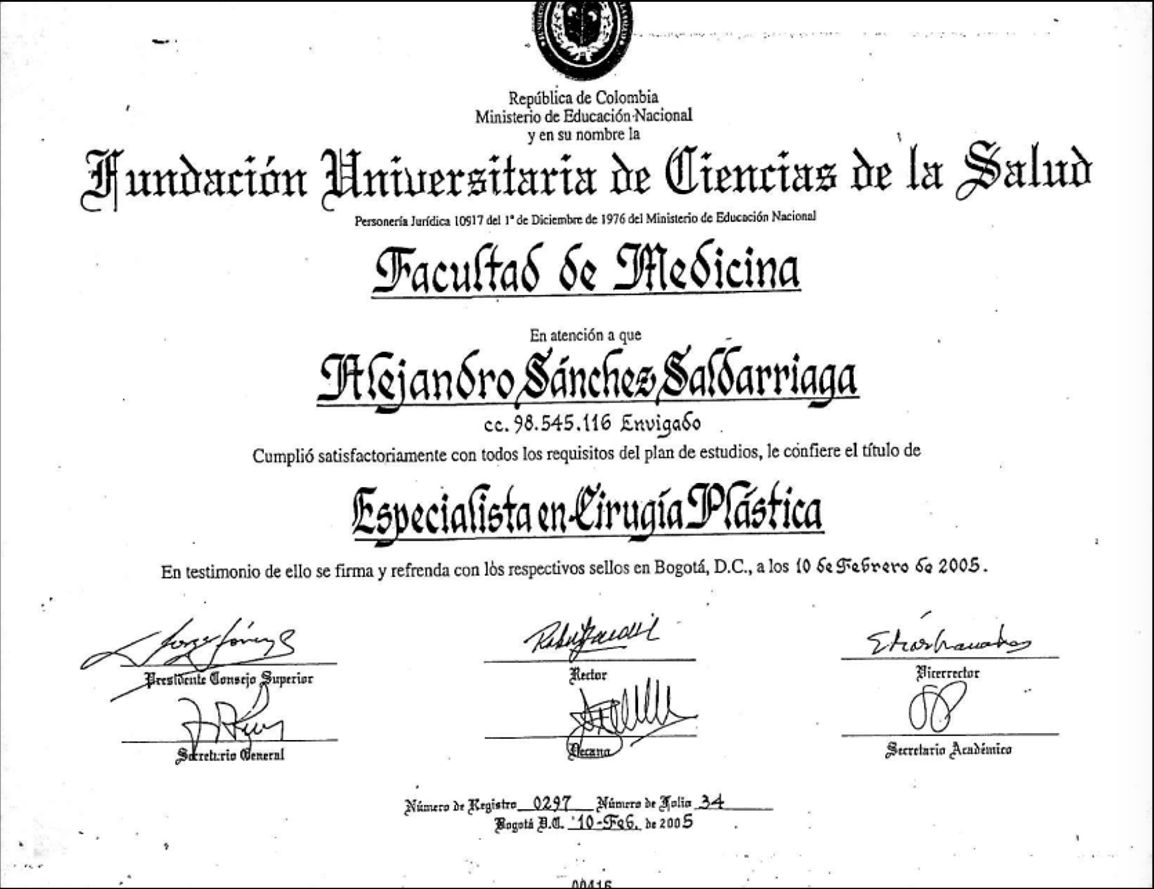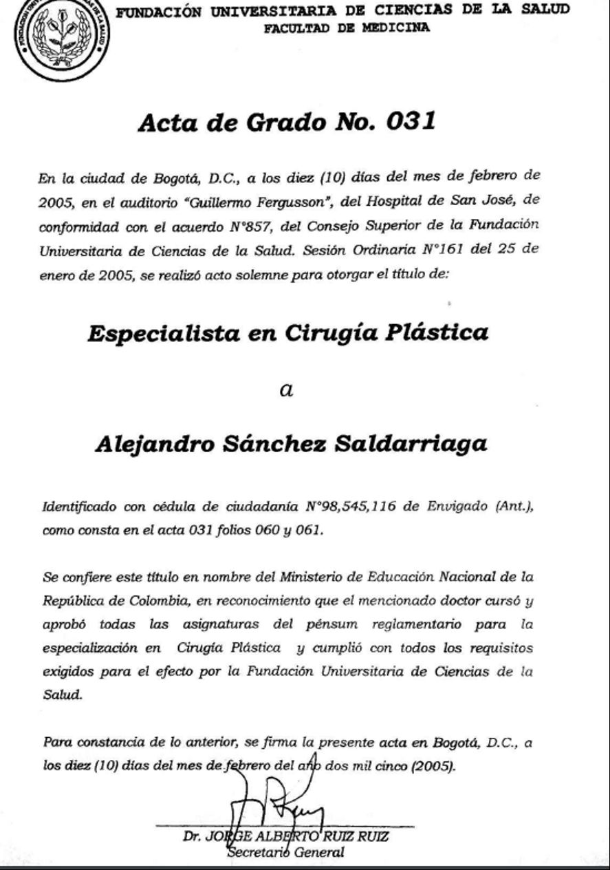 ¿Cuáles son las especialidades principales de Alejandro Sanchez Saldarriaga?Alejandro Sanchez Saldarriaga es Cirujano plástico. Te mostramos algunos de los servicios que ofrece gracias a su trayectoria y su amplia experiencia: Cirugía mamaria masculina (ginecomastia), Rejuvenecimiento facial, Reducción de Seno, Mamoplastia de reducción, Otoplastia, Blefaroplastia, Bichectomía, Mentoplastia, Mastopexia, Cirugia plástica facial.