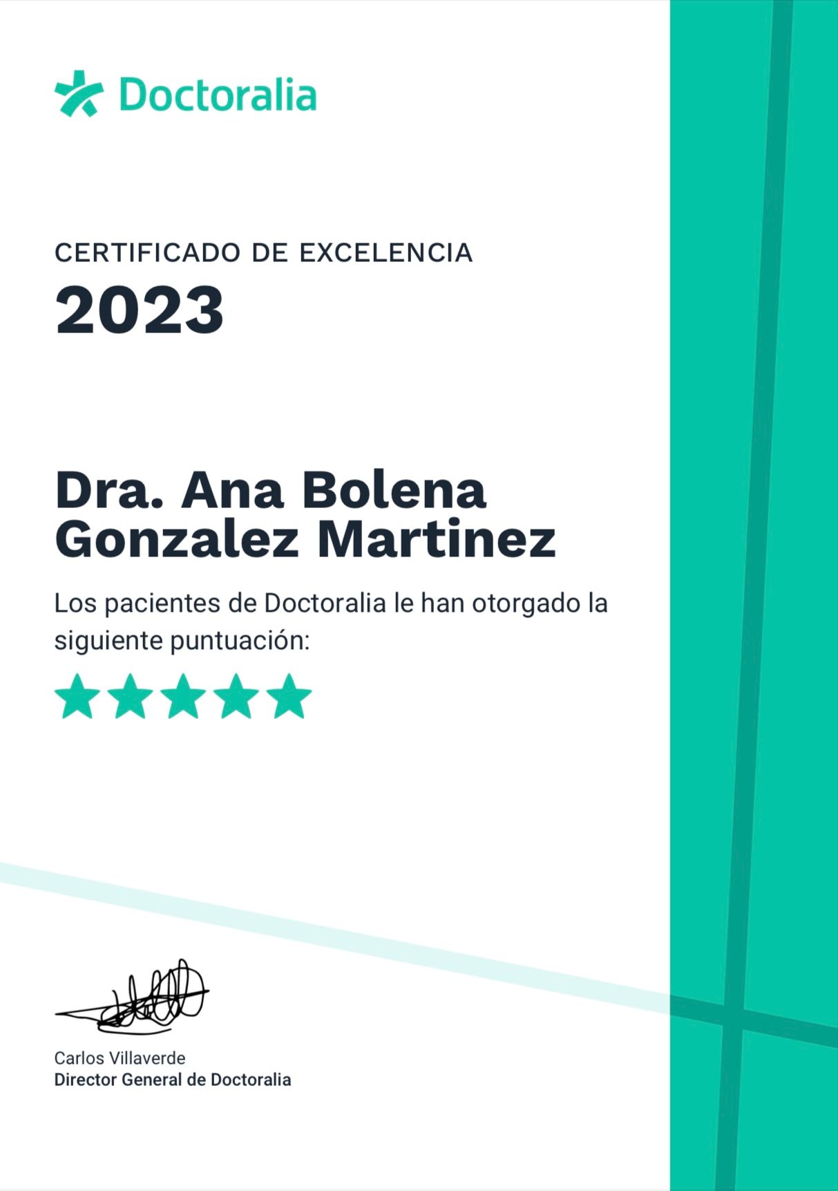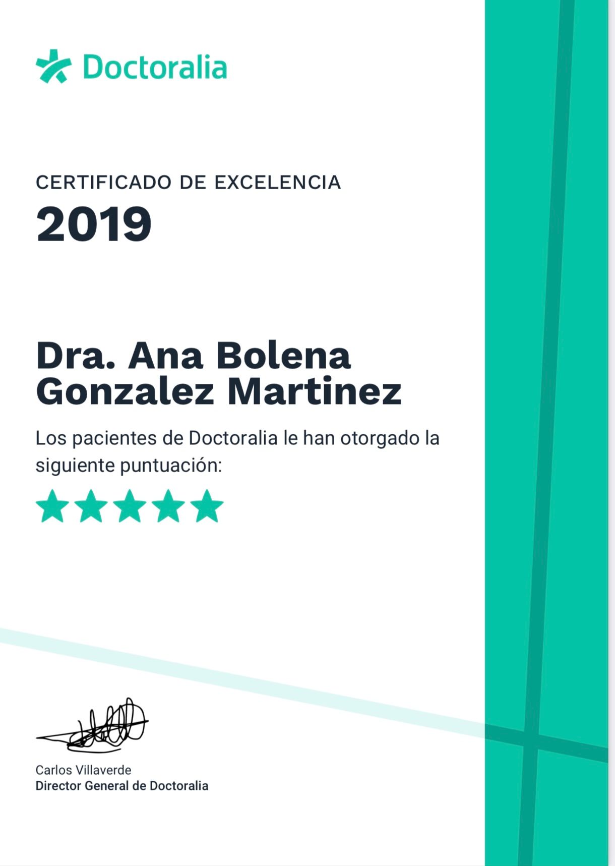 ¿Qué opinan los pacientes de Ana Bolena Gonzalez Martinez?Un total de 123 pacientes han querido dejar una opinión sincera y real sobre Ana Bolena Gonzalez Martinez, otorgándole además una valoración media de 5 estrellas (sobre un máximo de 5).