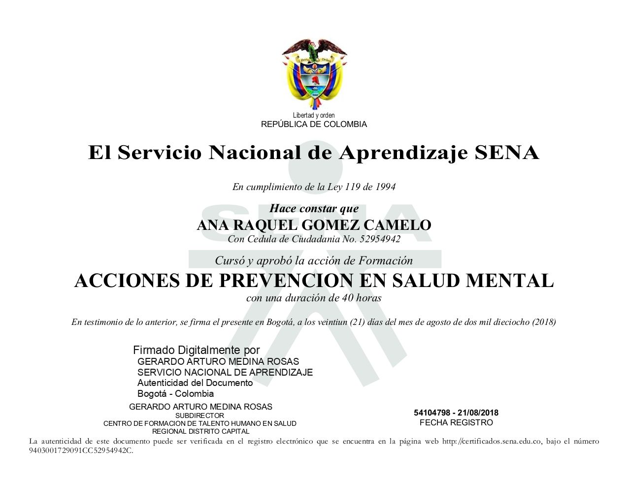 ¿Cuáles son las especialidades principales de Ana Raquel Gomez Camelo?Ana Raquel Gomez Camelo es Psicólogo. Te mostramos algunos de los servicios que ofrece gracias a su trayectoria y su amplia experiencia: Asesoría psicológica y psicoeducación, Capacitaciones empresariales, Pautas de crianza, Visita Psicología, Salud mental empresarial, Terapia Breve, Psicoterapia de pareja, Psicoterapia Individual, Terapia de pareja, Constelaciones familiares.