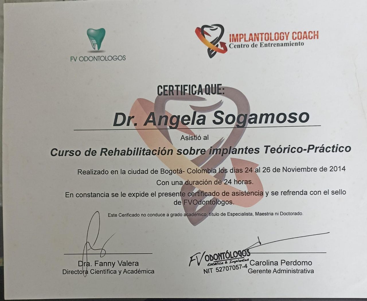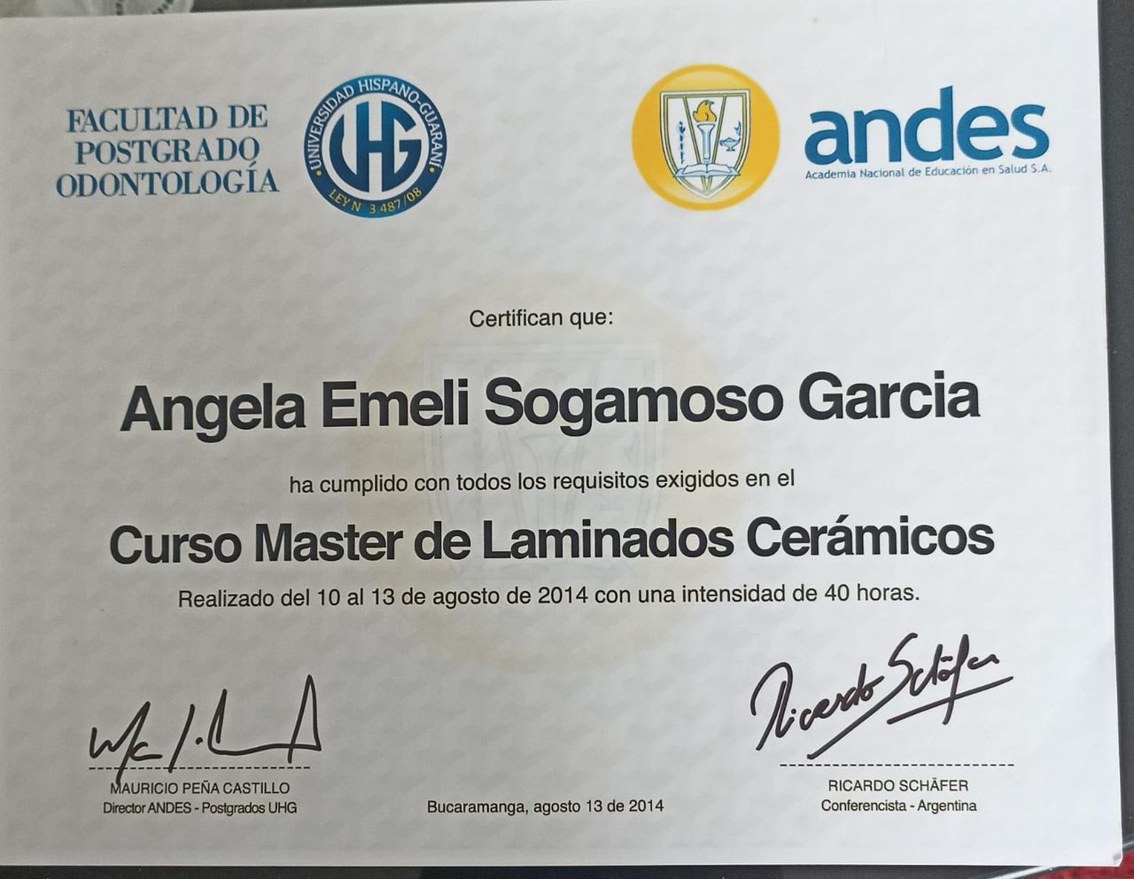 ¿Cuáles son las especialidades principales de Angela Emeli Sogamoso Garcia?Angela Emeli Sogamoso Garcia es Odontólogo. Te mostramos algunos de los servicios que ofrece gracias a su trayectoria y su amplia experiencia: Debridación de abscesos infecciosos en cavidad bucal, Blanqueamiento dental, Ortodoncia invisible clear Aligner, Visitas sucesivas Odontología, Extracción dental, Coronas en Zircon, Cirugía prepotesica, Implante dental, Carillas dentales, Regenaración osea previa a la colocación de implantes.