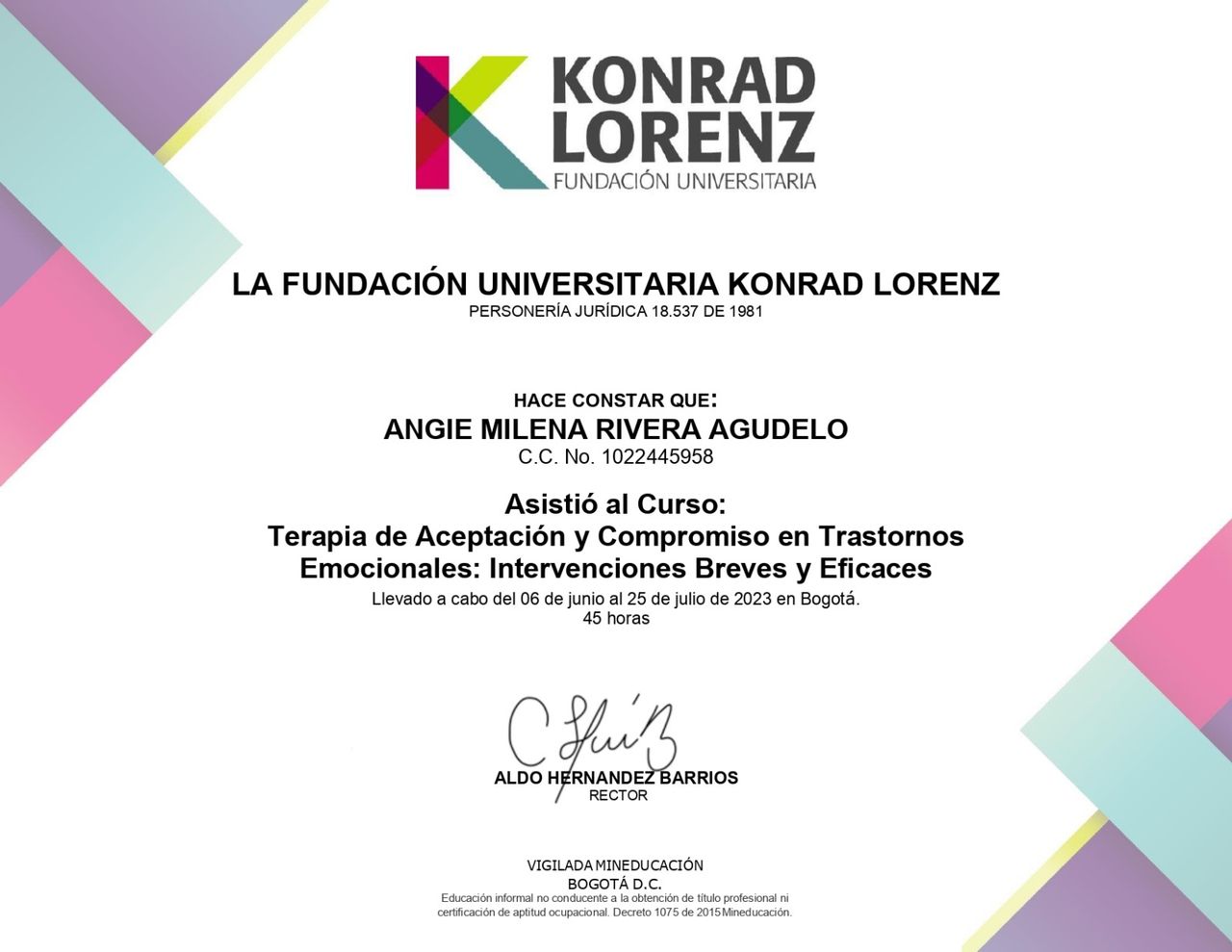 Formación: Especialista en Evaluación Clínica y Tratamiento Trastornos Emocionales, Diplomados en Terapias de Tercera Generación (ACT, DBT, BATD, PAF), Formación en Intervención en Crisis, Formación en Atención a Víctimas de Violencia Sexual y de Genero, Formación en Telepsicología.