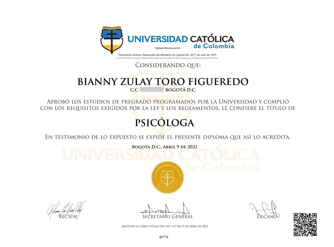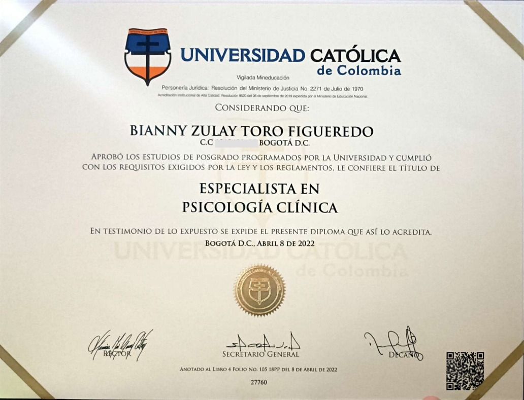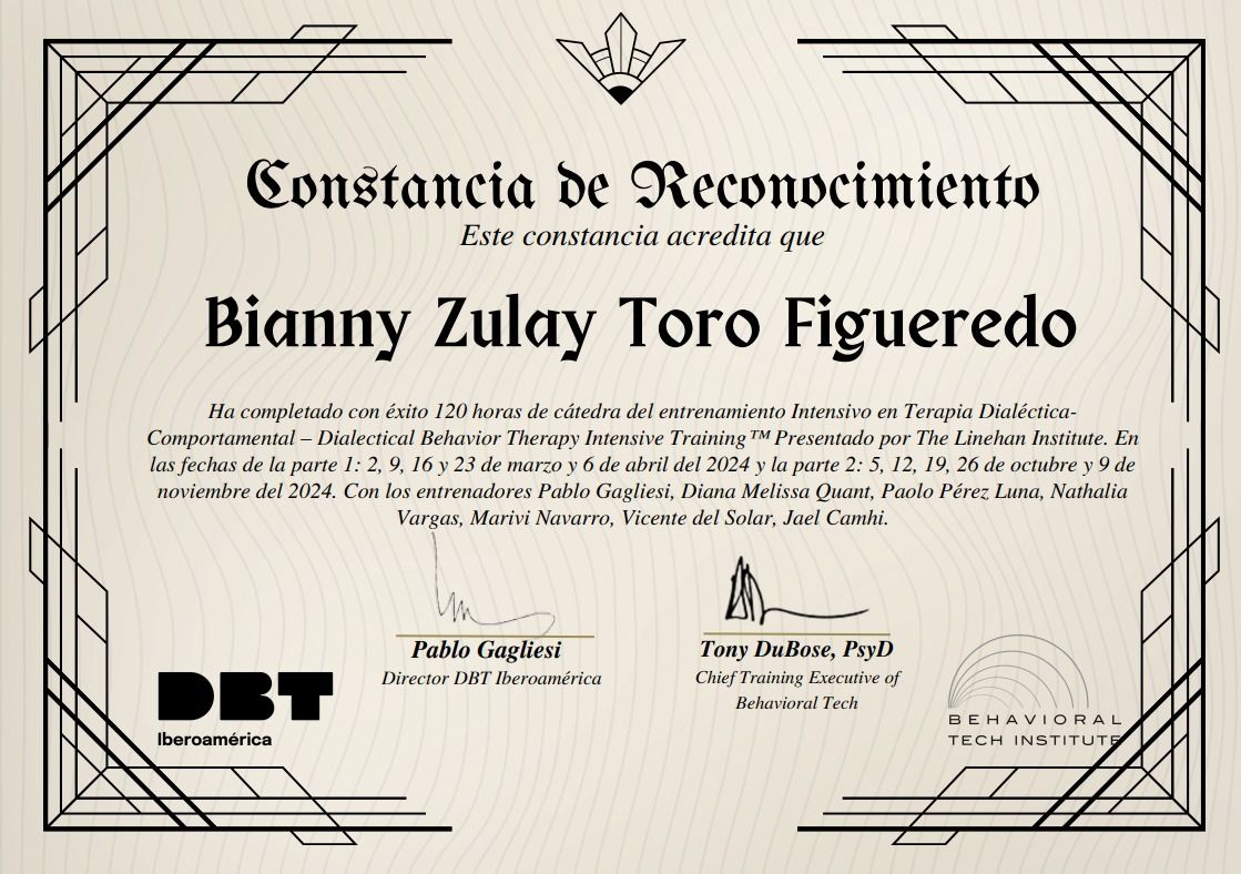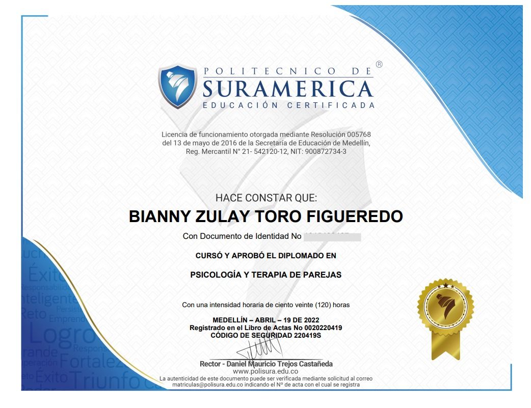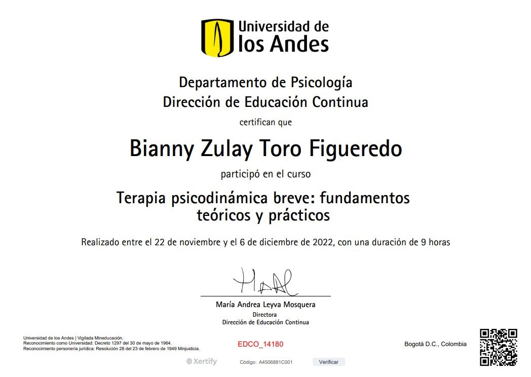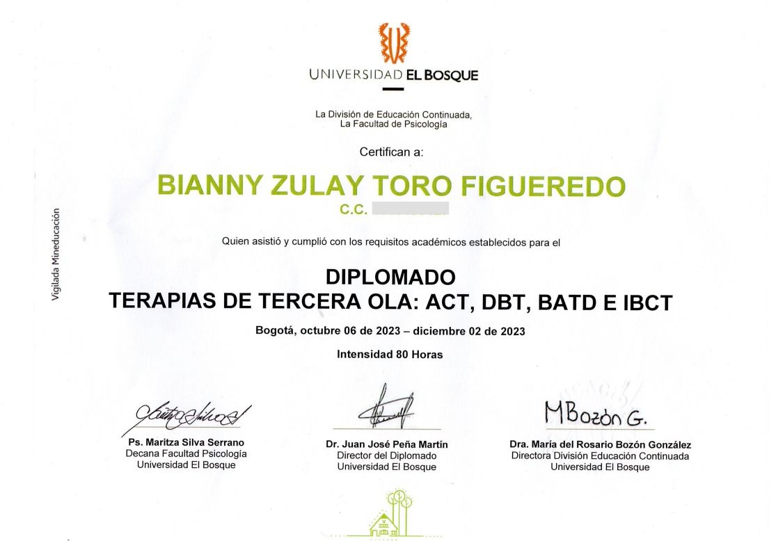 ¿Cuáles son las especialidades principales de Bianny Zulay Toro Figueredo?Bianny Zulay Toro Figueredo es Psicólogo. Te mostramos algunos de los servicios que ofrece gracias a su trayectoria y su amplia experiencia: Visita Psicología, Psicoterapia de pareja, Psicoterapia para adolescentes, Psicoterapia individual y de familia con adolescentes, Terapia dialéctico conductual (DBT), Terapia familiar, Consulta psicológica por identidad sexual, Psicoterapia Individual, Diversidad sexual, Consulta sexualidad consciente.