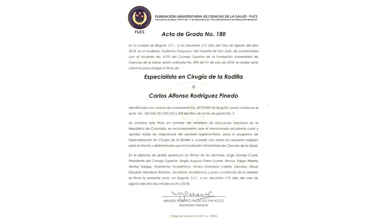 Me forme como Médico Cirujano en la Pontificia Universidad Javeriana (PUJ), misma institución donde curse la Especialidad en Ortopedia y Traumatología. Cuento con una Subespecialidad en Cirugía de la Rodilla de la Fundación Universitaria de Ciencias de la Salud (FUCS). Además, pertenezco a prestigiosas asociaciones como la Sociedad Colombiana de Cirugía Ortopédica y Traumatología (SCCOT).