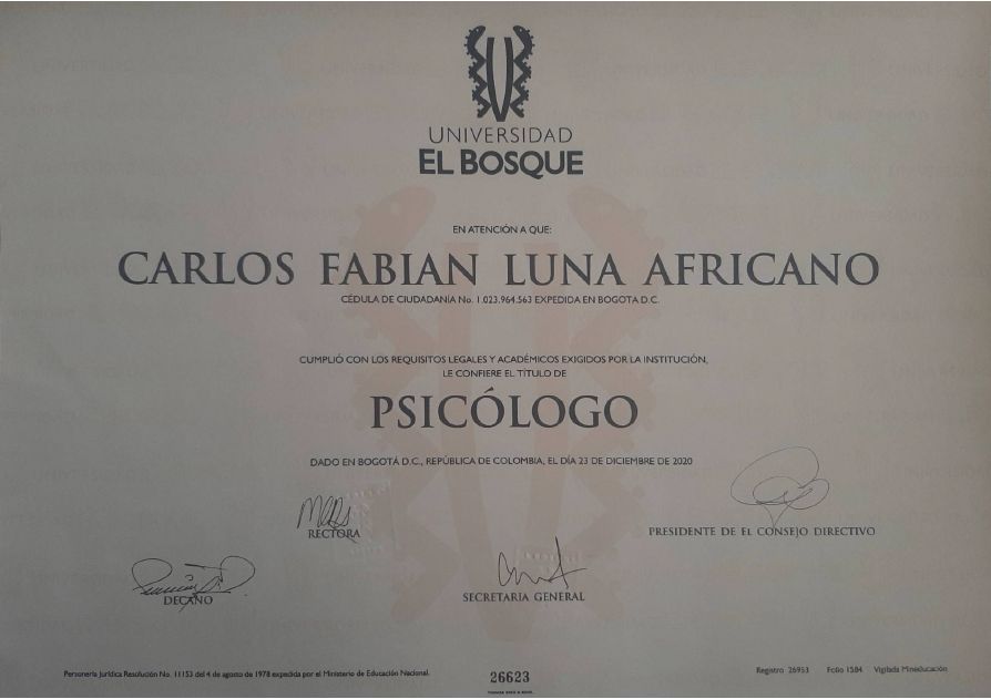 ¿Cuáles son las especialidades principales de Carlos Fabian Luna Africano?Carlos Fabian Luna Africano es Psicólogo. Te mostramos algunos de los servicios que ofrece gracias a su trayectoria y su amplia experiencia: Asesoría psicológica y psicoeducación, Psicoterapia de pareja, Psicoterapia Individual, Psicoterapia Infantil, Psicoterapia infantil (autismo), Consulta psicológica online, Psicoterapia virtual.