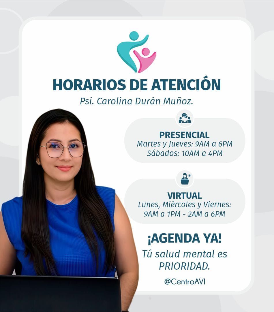 Hola, soy Carolina Durán, psicóloga con 5 años de experiencia acompañando a personas en sus procesos emocionales, brindando un espacio seguro para ser escuchadas sin juicios y con empatía.