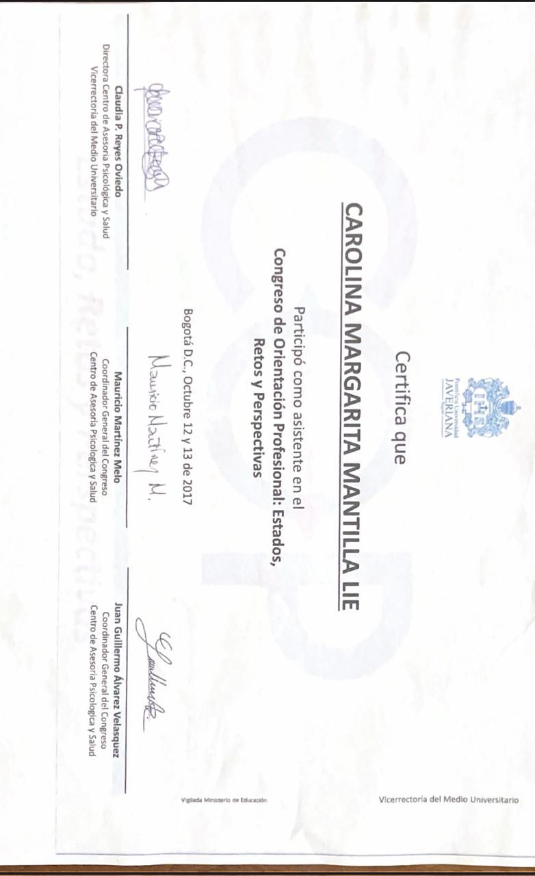 ¿Cuáles son las especialidades principales de Carolina Mantilla Liévano?Carolina Mantilla Liévano es Psicólogo. Te mostramos algunos de los servicios que ofrece gracias a su trayectoria y su amplia experiencia: Visita Psicología, Terapia familiar, Consulta por ansiedad, Terapia cognitiva del comportamiento (TCC), Orientación vocacional, Consulta psicológica infantil, Terapia de pareja, Psicoterapia Individual, Grupos de apoyo, Psicoterapia Infantil.