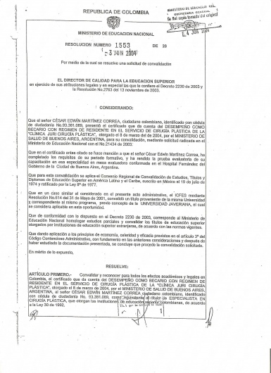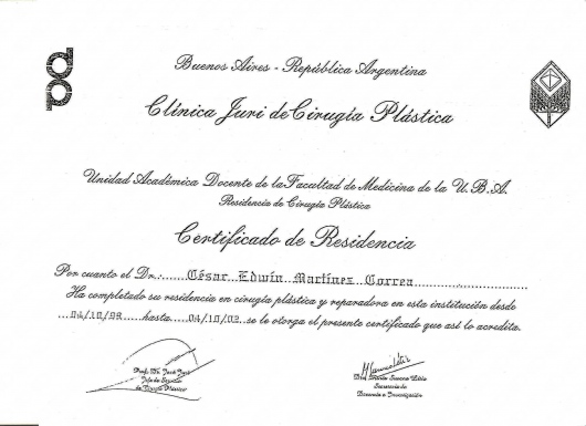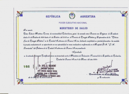 Realizo una especialización en cirugía plástica,estética y reparadora en Buenos Aires Argentina en la Clínica Juri en cirugía plástica- con resolución de homologacion del titulo de Especialista 1553/04 del ministerio nacional de Colombia, en el año 2004 en Brasil realizo diferentes rotaciones como fellow de la clínica Ivo Pitanguy y también con el doctor Ronaldo Pontes, dos de los mas reconocidos renombrados cirujanos plásticos en el mundo.