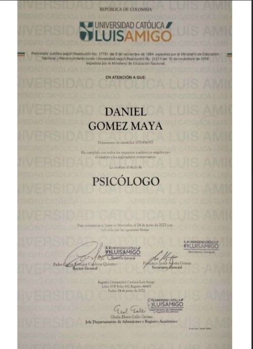 ¿Cuáles son las especialidades principales de Daniel Gomez Maya?Daniel Gomez Maya es Psicólogo. Te mostramos algunos de los servicios que ofrece gracias a su trayectoria y su amplia experiencia: Psicoterapia Gestalt, Psicoterapia Individual, Terapia cognitiva del comportamiento (TCC), Psicoterapia de duelo, Consulta psicológica evaluativa, Psicoterapia para adolescentes, Psicoterapia adulto mayor, Consulta por psicología, Psicoterapia Infantil, Consulta en línea.