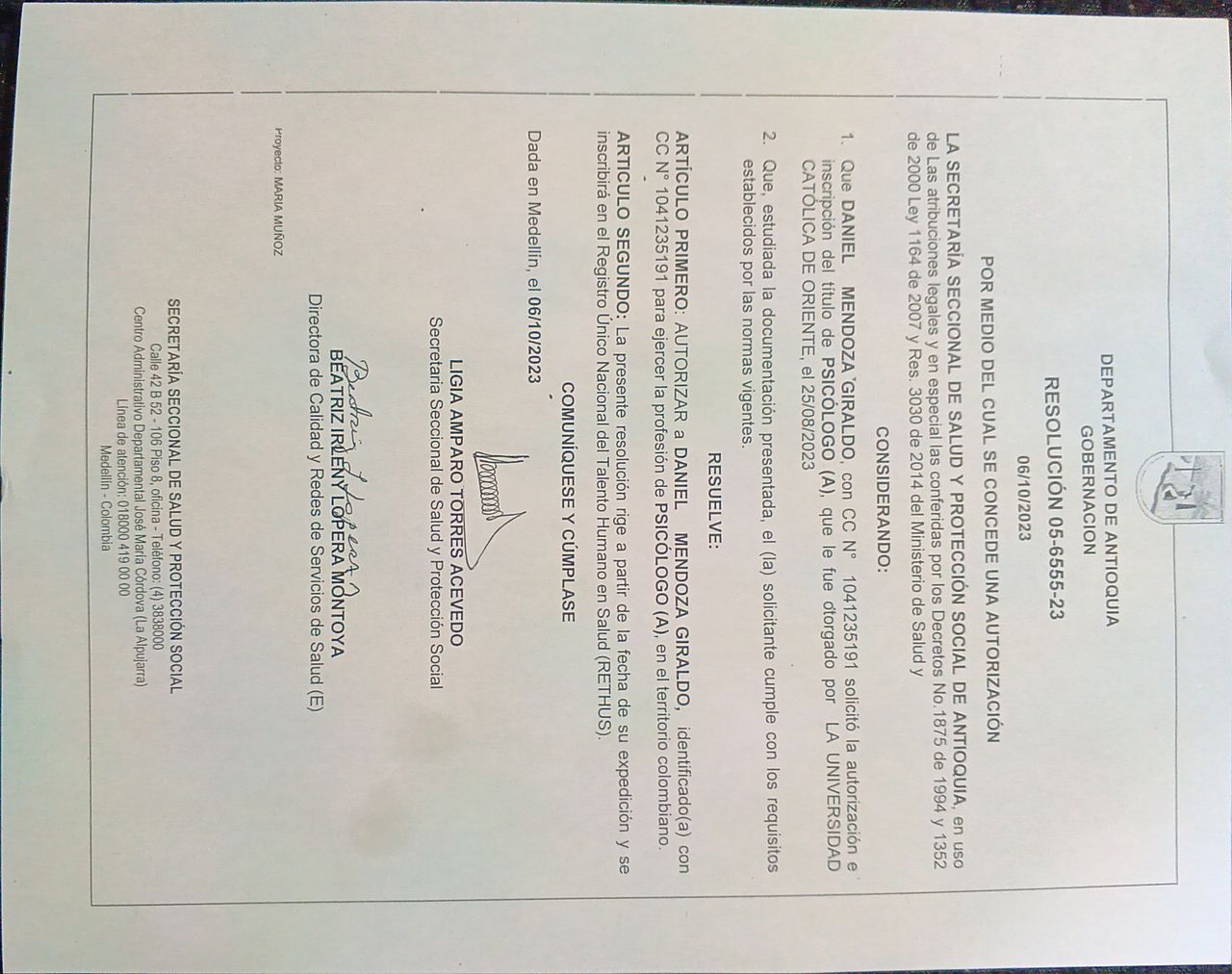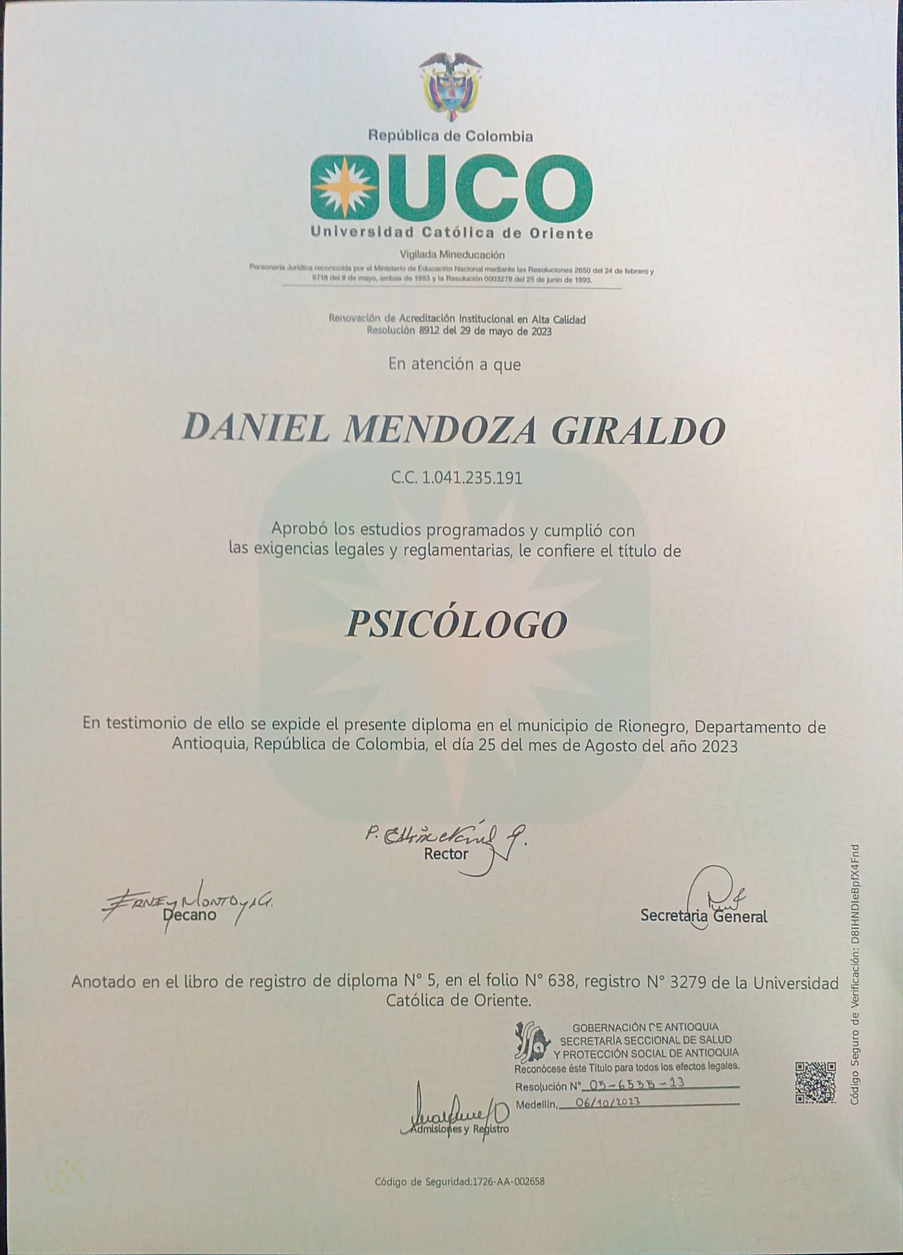¿Cuáles son las especialidades principales de Daniel Mendoza Giraldo?Daniel Mendoza Giraldo es Psicólogo. Te mostramos algunos de los servicios que ofrece gracias a su trayectoria y su amplia experiencia: Visita Psicología, Consulta en línea, Psicoterapia virtual, Consulta psicológica online, Telemedicina, Siguientes consultas online.