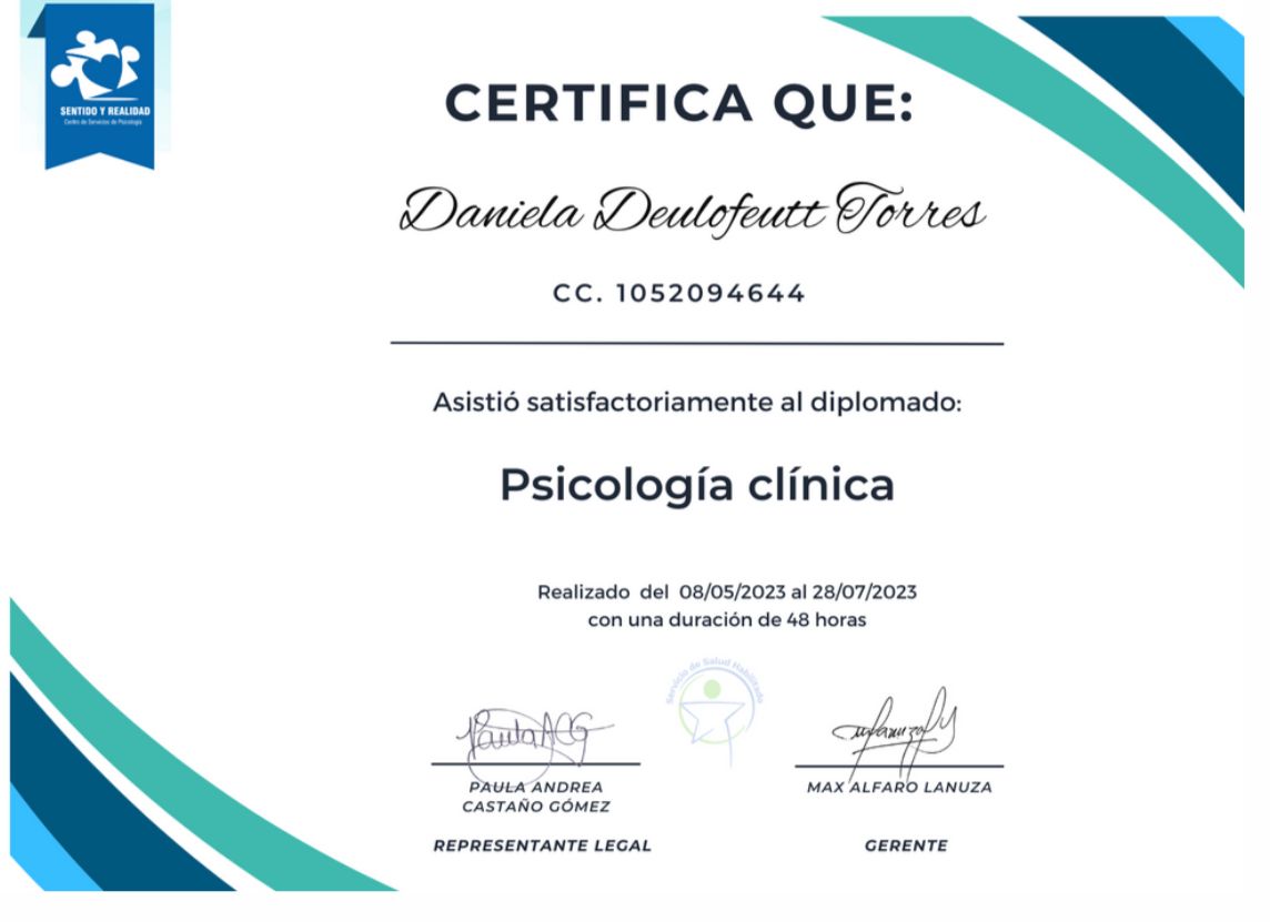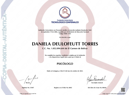 ¿Cuáles son las especialidades principales de Daniela Deulofeutt Torres?Daniela Deulofeutt Torres es Psicólogo. Te mostramos algunos de los servicios que ofrece gracias a su trayectoria y su amplia experiencia: Psicoterapia Individual, Consulta inicial, Consulta en línea, Valoración incial, Sesiones virtuales de seguimiento, Consulta en línea internacional, Consulta psicológica por ansiedad, Consulta on line internacional, Visita Psicología.