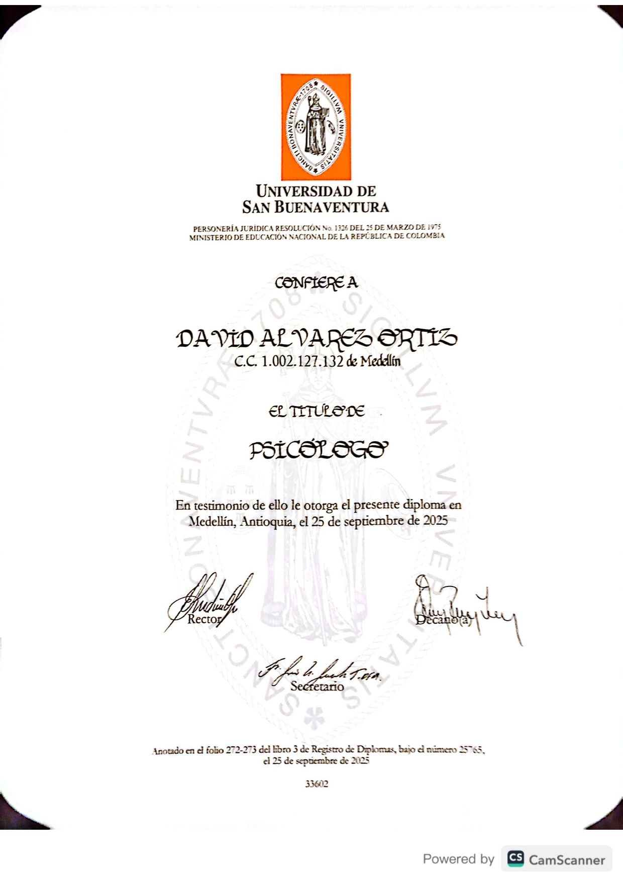 ¿Cuáles son las especialidades principales de David Álvarez Ortíz?David Álvarez Ortíz es Psicólogo. Te mostramos algunos de los servicios que ofrece gracias a su trayectoria y su amplia experiencia: Consulta psicológica por ansiedad, Rendimiento académico, Pautas de crianza, Evaluación psicológica, Asesoría psicológica y psicoeducación, Terapia cognitiva del comportamiento (TCC), Salud mental empresarial, Consulta psicológica por depresión, Orientación vocacional, Psicoterapia Individual.