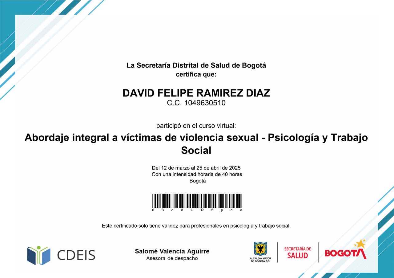 ¿Cuáles son las especialidades principales de David Felipe Ramírez Díaz?David Felipe Ramírez Díaz es Psicólogo. Te mostramos algunos de los servicios que ofrece gracias a su trayectoria y su amplia experiencia: Visita Psicología, Consulta psicológica por depresión, Consulta en línea, Consulta psicológica online, Psicoterapia virtual.