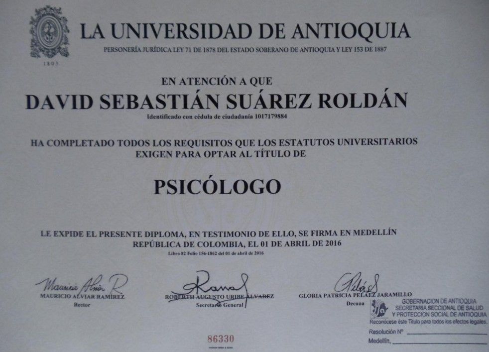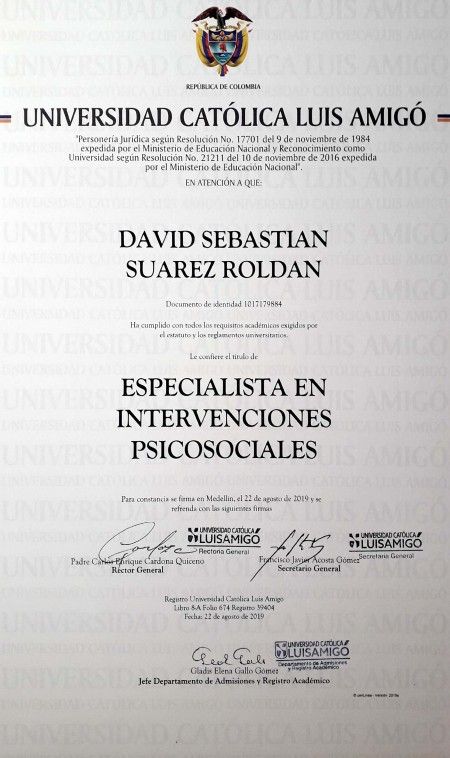 ¿Cuáles son las especialidades principales de David Sebastian Suarez Roldan?David Sebastian Suarez Roldan es Psicólogo. Te mostramos algunos de los servicios que ofrece gracias a su trayectoria y su amplia experiencia: Visita Psicología, Consulta psicológica online, Consulta psicológica con enfoque de arte terapia, Acompañamiento psicológico en la vejez, Bienestar emocional, Problemas de pareja, Análisis existencial, Acompañamiento a jubilados, Asesoría psicológica y psicoeducación, Asesoría familiar.