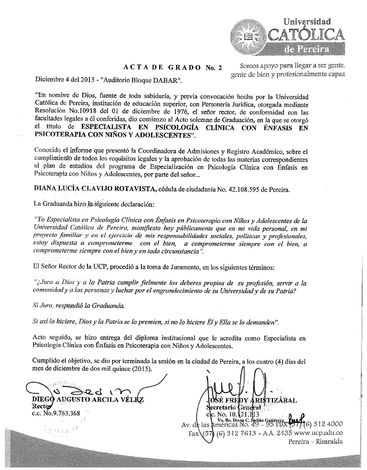 ¿Cuáles son las especialidades principales de Diana Lucía Clavijo Rotavista?Diana Lucía Clavijo Rotavista es Psicólogo. Te mostramos algunos de los servicios que ofrece gracias a su trayectoria y su amplia experiencia: Visita Psicología, Terapia de pareja y crianza, Consulta psicológica adolescentes virtual, Asesoría psicológica y psicoeducación, Consulta psicológica online, Consulta virtual de pareja, Psicoterapia virtual, Consulta en línea, Asesoría psicológica, Asesoría familiar.
