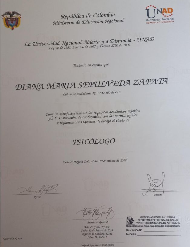 ¿Cuáles son las especialidades principales de Diana María Sepúlveda Zapata?Diana María Sepúlveda Zapata es Psicólogo. Te mostramos algunos de los servicios que ofrece gracias a su trayectoria y su amplia experiencia: Asesoría psicológica y psicoeducación, Consulta psicológica infantil, Visita Psicología, Rendimiento académico, Evaluación psicológica, Psicoterapia Individual, Psicoterapia Infantil, Terapia cognitiva del comportamiento (TCC), Consulta por ansiedad, Consulta psicológica online.