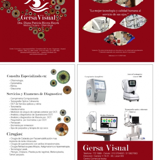 profesional integra con mas de 20 años de experincia, en manejo de alta tecnologia en cirugia de ojos,con amplia experiencia en cirugia de catarata con tecnica de ultrasonido de FACO y extracapsular, Cx refractica , examenes de pentacam, tomografia, biometria.,topografia, Optometria VIP, atencion pediatrica en ojos, terapia de parpados y ojo seco, graduada y especilizada en la universidad militar; con altos valores humanos y cristianos, enmarcados dentro de la etica y atencion del alta calidad