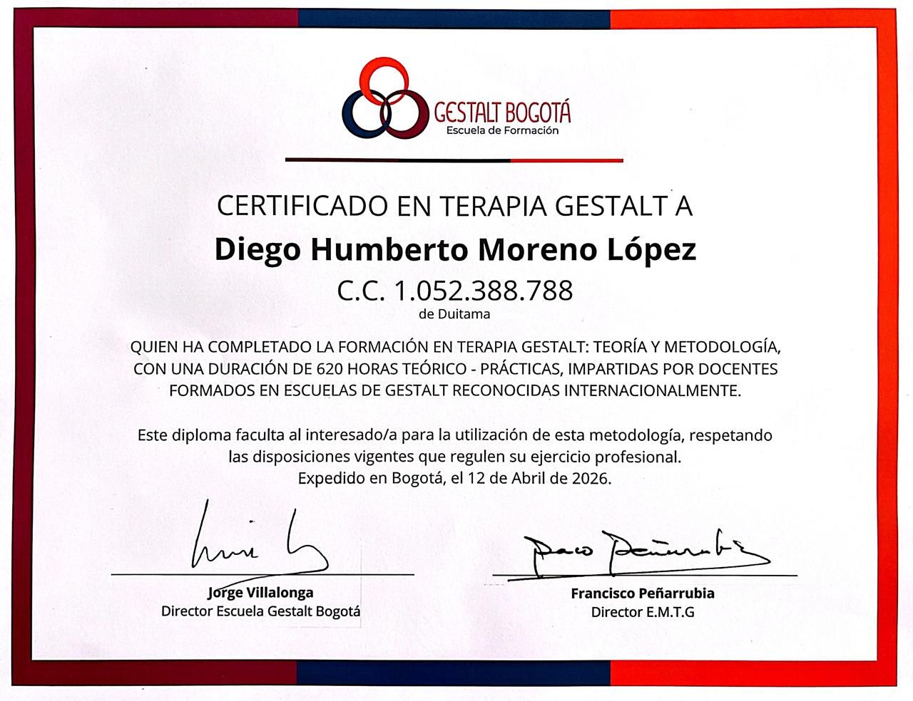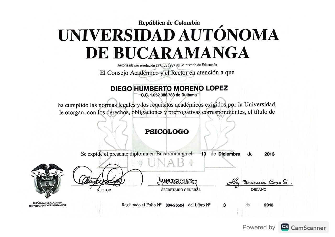¿Cuáles son las especialidades principales de Diego Humberto Moreno Lopez?Diego Humberto Moreno Lopez es Psicólogo. Te mostramos algunos de los servicios que ofrece gracias a su trayectoria y su amplia experiencia: Psicoterapia virtual, Siguientes consultas online, Consulta virtual de pareja, Consulta psicológica online.