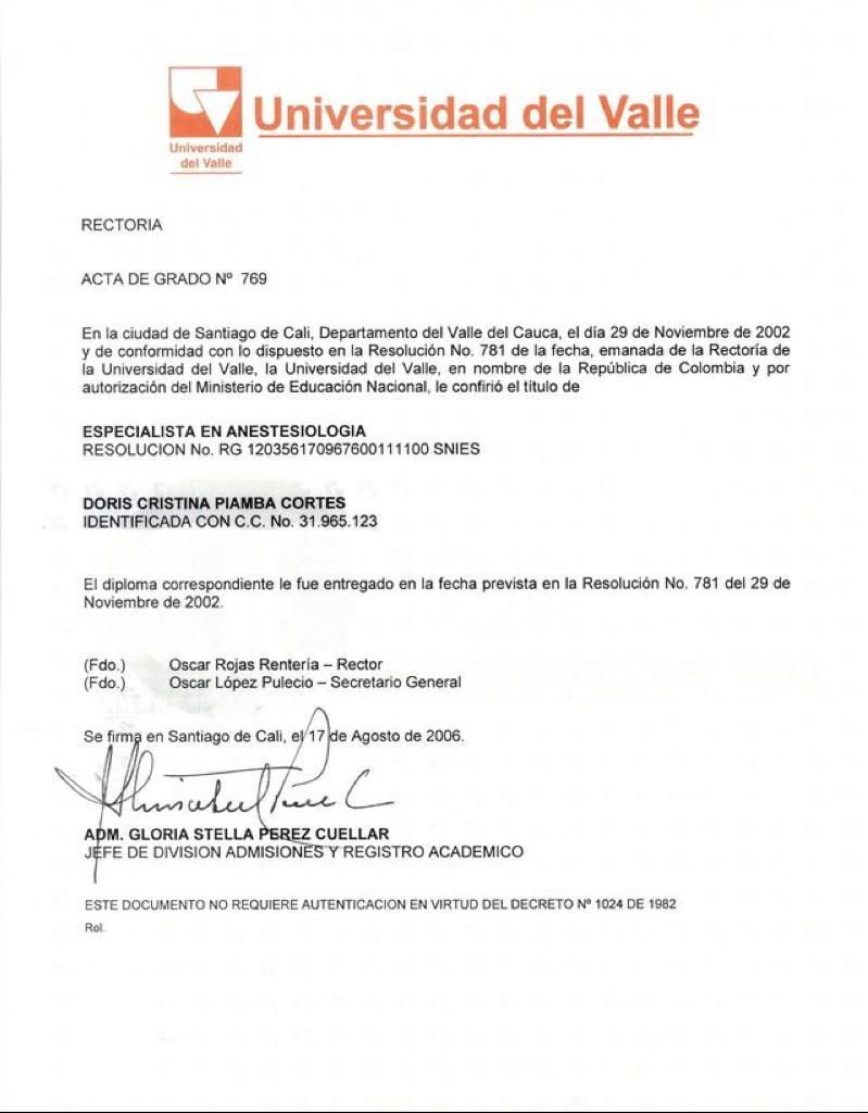 ¿Cuáles son las especialidades principales de Doris Cristina Piamba Cortes?Doris Cristina Piamba Cortes es Anestesiólogo. Te mostramos algunos de los servicios que ofrece gracias a su trayectoria y su amplia experiencia: Visita Anestesiología, Medicina Integrativa, Colocación de bombas intratecales, Anestesia epidural, Consulta preanestésica, Anestesia General, Anestesia espinal, Anestesia Regional, Consulta en línea.