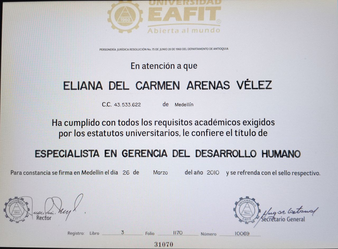¿Cuáles son las especialidades principales de Eliana Arenas Vélez?Eliana Arenas Vélez es Psicólogo. Te mostramos algunos de los servicios que ofrece gracias a su trayectoria y su amplia experiencia: Asesoría psicológica y psicoeducación, Capacitaciones empresariales, Visita Psicología, Salud mental empresarial, Selección de personal, Terapia Breve, Visita domiciliaria Psicología, Visitas sucesivas Psicología, Evaluación psicológica, Grupos de apoyo.