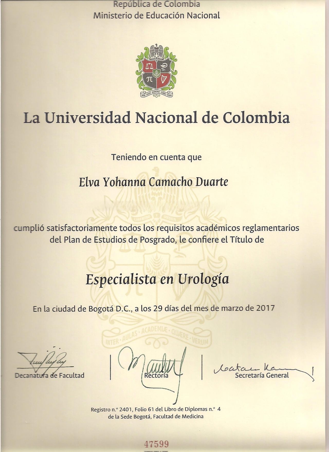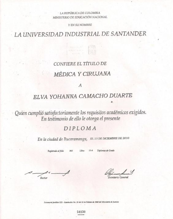 Soy Elva Yohanna Camacho Duarte, médica y cirujana de la Universidad Industrial de Santander (UIS), especialista en Urología de la Universidad Nacional de Colombia.