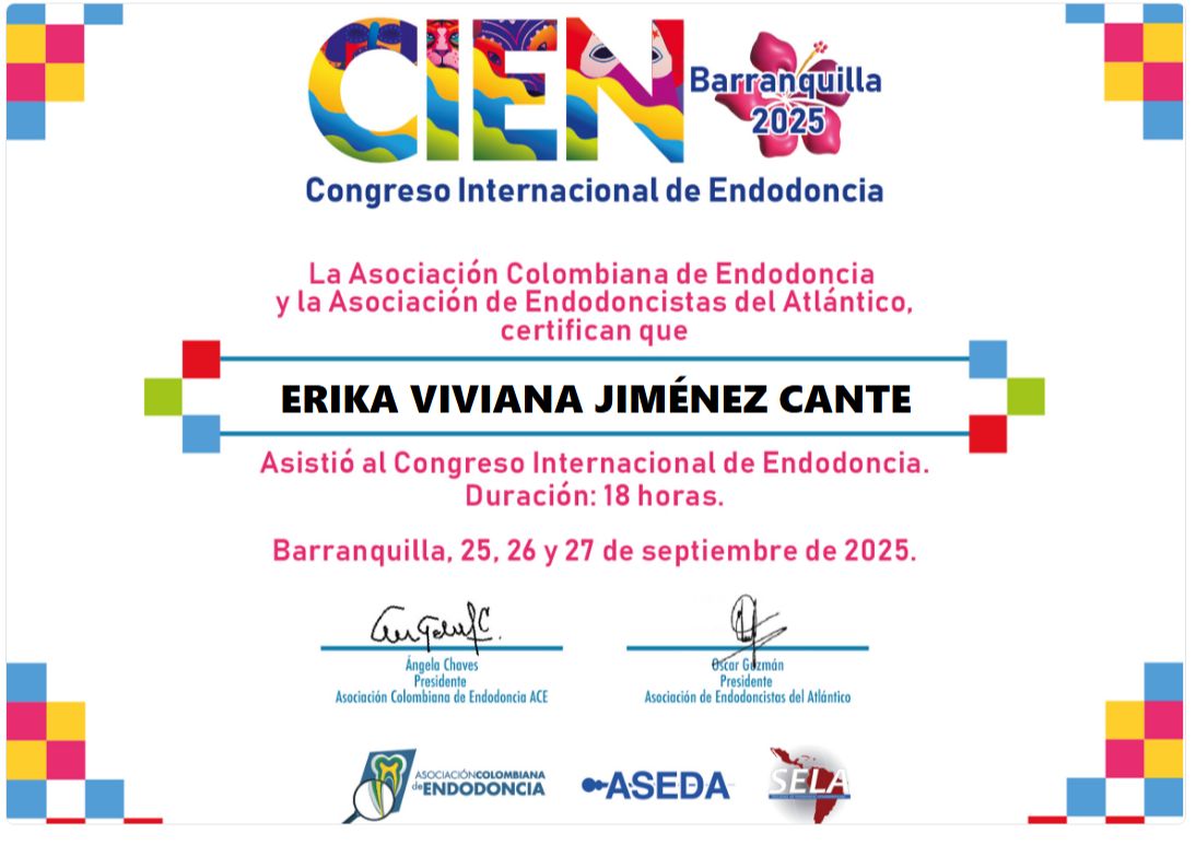 Soy odontóloga de la Universidad Antonio Nariño, con más de 11 años de experiencia clínica, y Especialista en Endodoncia de la Universidad Santo Tomás (USTA), donde perfeccioné mi enfoque en procedimientos conservadores, mínimamente invasivos y de alta complejidad en el manejo del tejido pulpar y periapical.