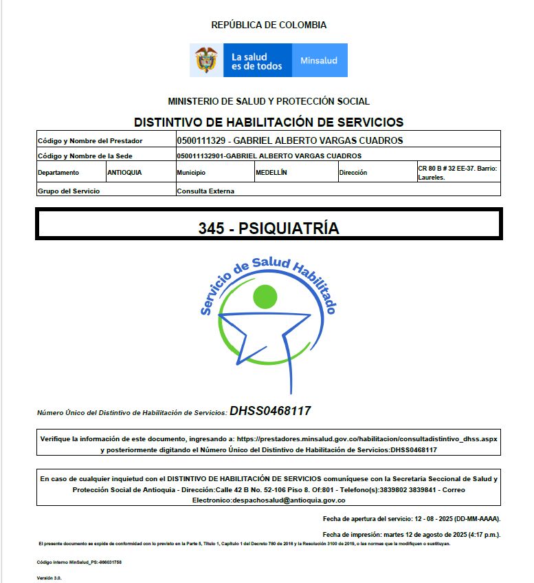 ¿Cuáles son las especialidades principales de Gabriel Vargas Cuadros?Gabriel Vargas Cuadros es Psiquiatra. Te mostramos algunos de los servicios que ofrece gracias a su trayectoria y su amplia experiencia: Manejo de los problemas de autoafirmación (miedos e inseguridad), Prevención, manejo y control de estrés, Visita Psiquiatría, Tratamiento del alcoholismo (problemas con el alcohol), Diagnóstico y tratamiento de trastornos del sueño, Tratamiento de la ansiedad materna, Tratamiento del insomnio, Tratamiento para la depresión postparto, Atención integral en adicciones, Atención integral en adicciones y comportamiento.
