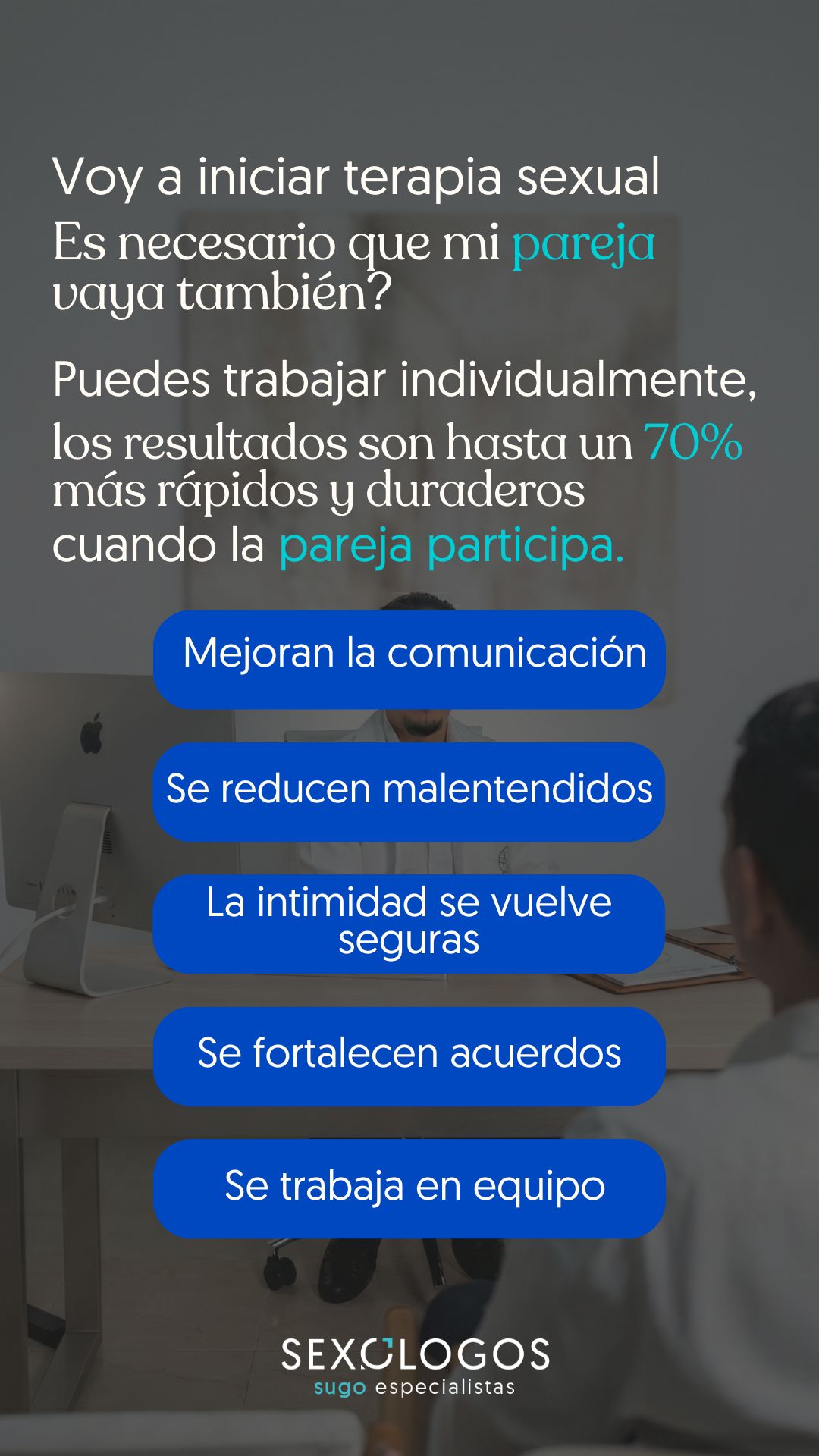 Aunque puedes iniciar tu proceso individualmente, la evidencia muestra que los resultados son hasta un 70% más rápidos y duraderos cuando la pareja participa. ¿Por qué? Porque la sexualidad es una experiencia compartida y, cuando ambos se involucran, dejan de ser "tú contra mí" para convertirse en un equipo.