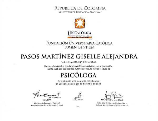 ¿Cuáles son las especialidades principales de Giselle Pasos?Giselle Pasos es Psicólogo. Te mostramos algunos de los servicios que ofrece gracias a su trayectoria y su amplia experiencia: Asesoría psicológica y psicoeducación, Pautas de crianza, Salud mental empresarial, Tratamiento del alcoholismo (problemas con el alcohol), Psicoterapia de pareja, Psicoterapia Individual, Terapia cognitiva del comportamiento (TCC), Psicoterapia de duelo, Duelo por ruptura de pareja, Certificado animales de apoyo emocional.