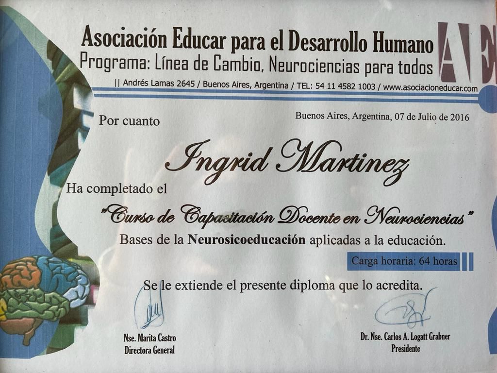 ¿Cuáles son las especialidades principales de Ingrid Martínez?Ingrid Martínez es Psicólogo. Te mostramos algunos de los servicios que ofrece gracias a su trayectoria y su amplia experiencia: Pruebas psicotécnicas, Capacitaciones empresariales, Valoración psicológica clínica, Coaching Familiar, Neurofeedback, Coaching de Equipos, Consulta psicológica infantil, Pruebas de Reclutamiento, Evaluación Neuropsicológica, Asesoría psicológica y psicoeducación.