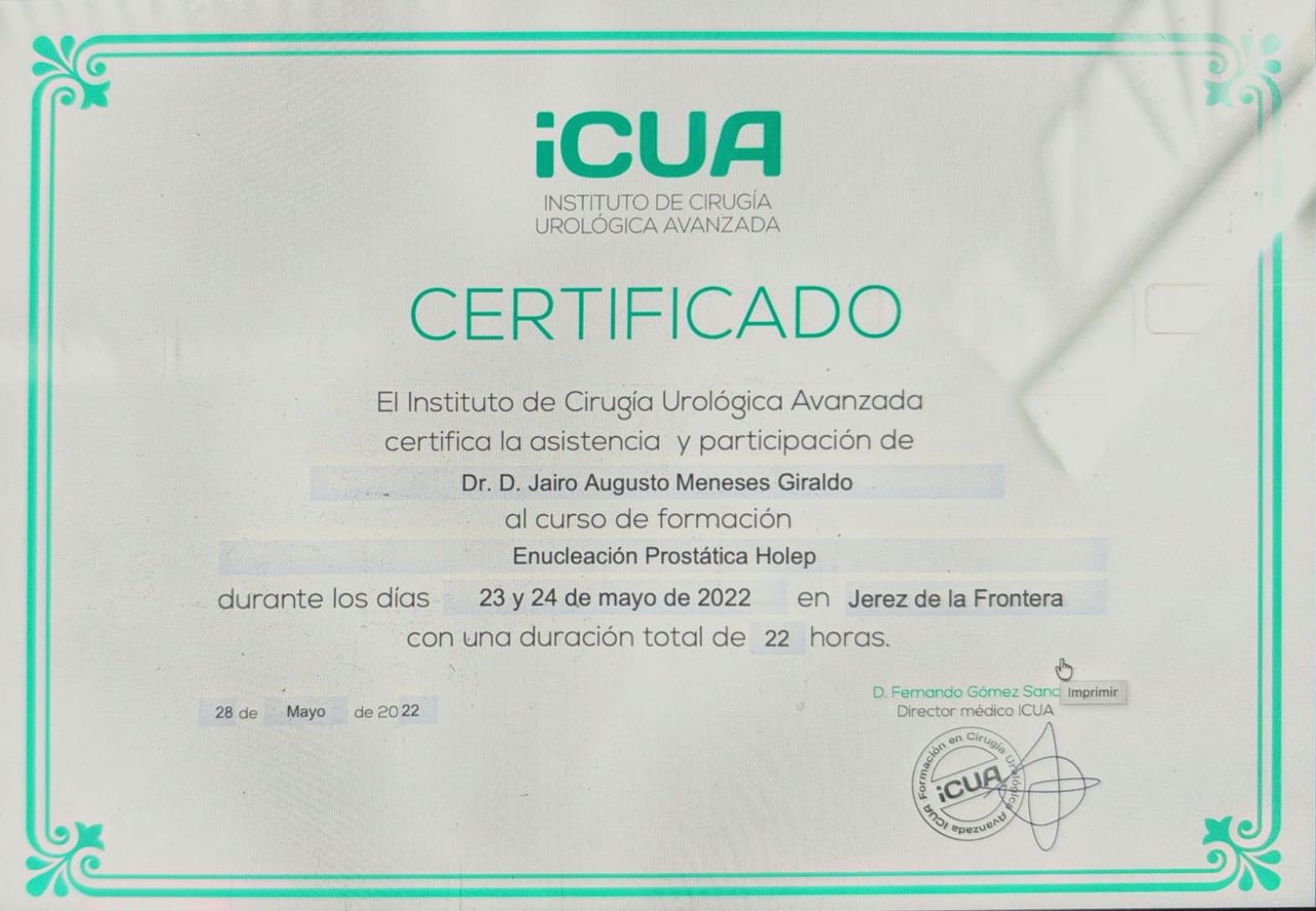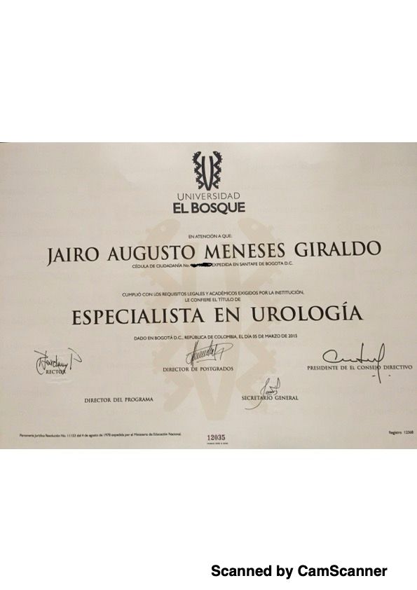 ¿Cuáles son las especialidades principales de Jairo Augusto Meneses Giraldo?Jairo Augusto Meneses Giraldo es Urólogo. Te mostramos algunos de los servicios que ofrece gracias a su trayectoria y su amplia experiencia: Visita Urología, Cirugía láser de próstata (Greenlight), Cistoscopia transuretral, Vasectomía, Circuncisión.