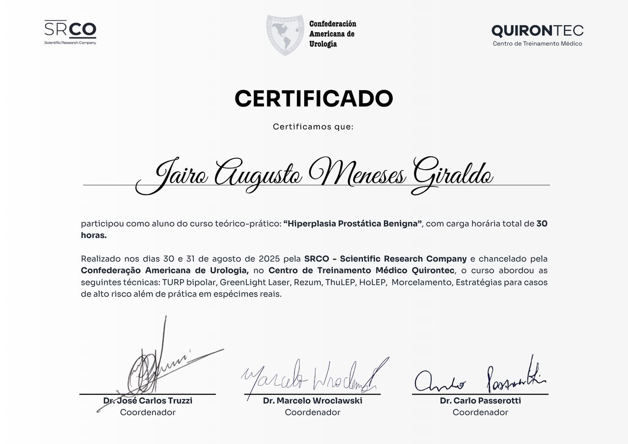 Soy un Médico urólogo especializado en el manejo de Técnicas Mínimamente Invasivas para tratar los síntomas urinarios causados por la Hiperplasia Prostática Benigna (HPB). Con una sólida formación y años de experiencia, ofrezco tratamientos innovadores y personalizados que permiten mejorar la calidad de vida de mis pacientes, minimizando los riesgos y acortando los tiempos de recuperación. En mi carrera, he perfeccionado el uso de procedimientos avanzados como la Resección Transuretral de la Próstata (RTUP), la Vaporización con Láser y la Enucleación Prostática con laser Holmium (HOLEP), brindando alternativas más seguras y eficaces para tratar el Crecimiento Benigno de Próstata.