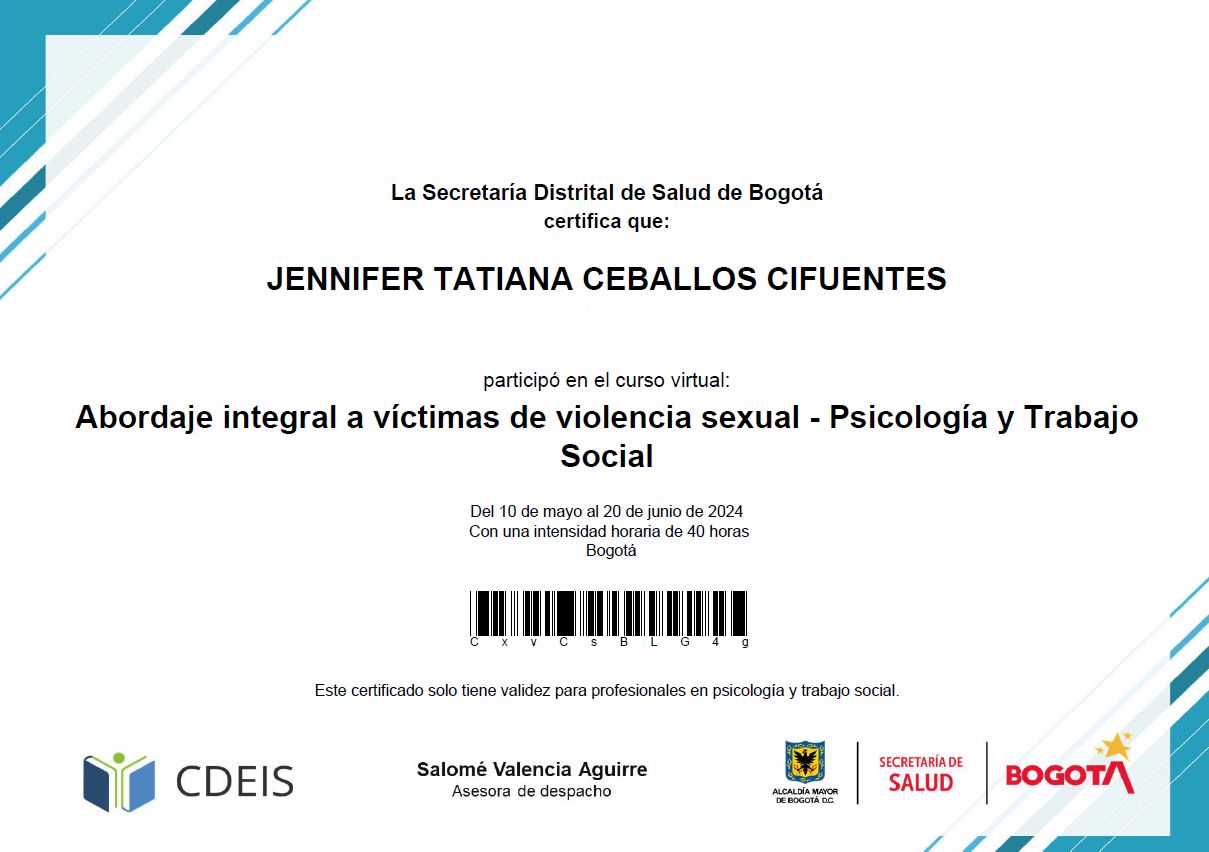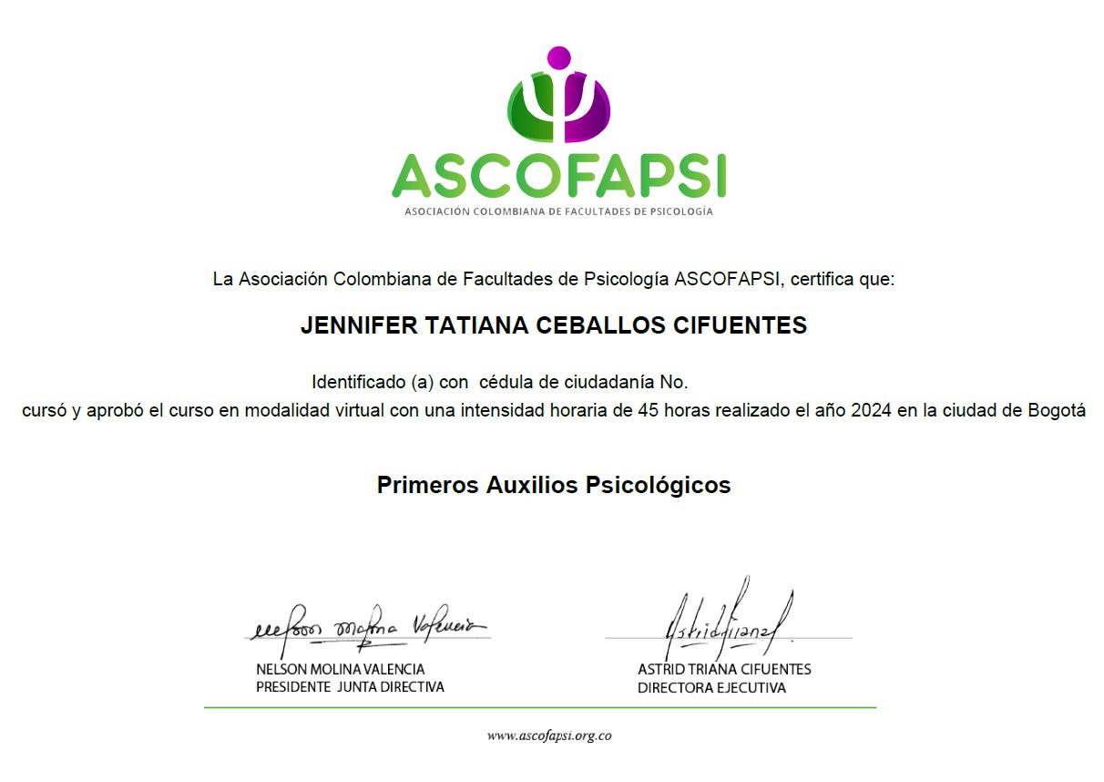 ¿Cuáles son las especialidades principales de Jennifer Tatiana Ceballos Cifuentes?Jennifer Tatiana Ceballos Cifuentes es Psicólogo. Te mostramos algunos de los servicios que ofrece gracias a su trayectoria y su amplia experiencia: Consulta psicológica, Capacitaciones empresariales, Terapia de pareja, Asesoría psicológica y psicoeducación, Consulta por ansiedad, Orientación vocacional, Pautas de crianza, Psicoterapia de pareja, Terapia cognitiva del comportamiento (TCC), Tratamiento para la depresión.