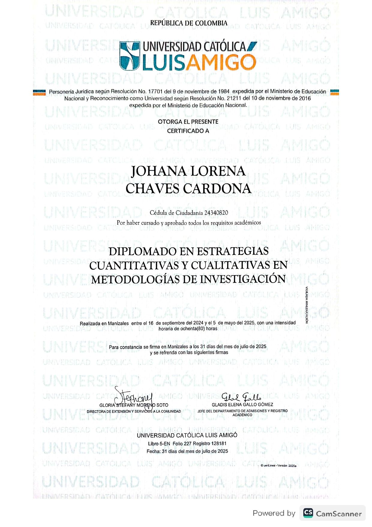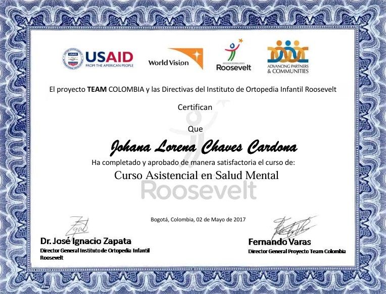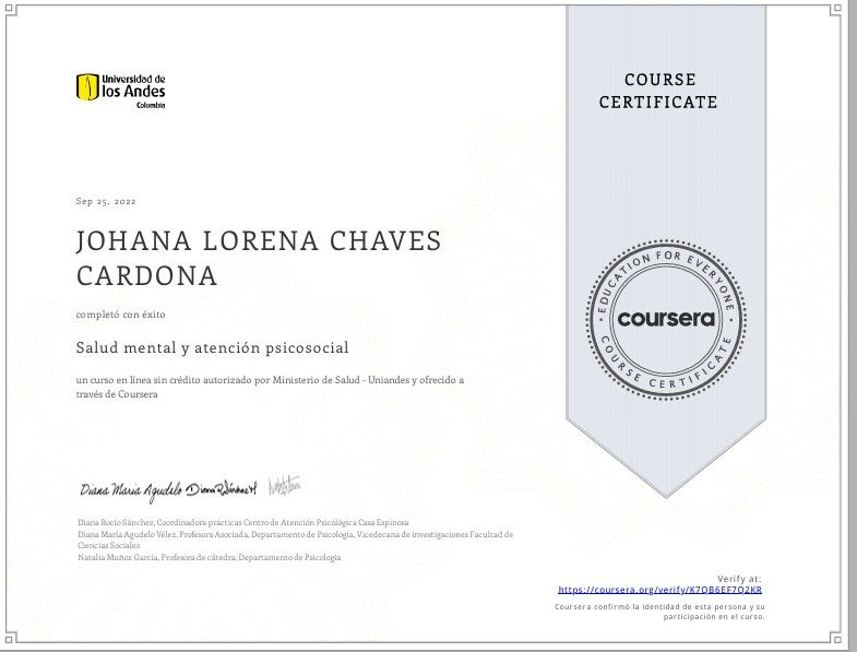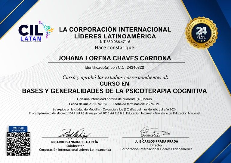 ¿Cuáles son las especialidades principales de Johana Lorena Chaves Cardona?Johana Lorena Chaves Cardona es Psicólogo. Te mostramos algunos de los servicios que ofrece gracias a su trayectoria y su amplia experiencia: Asesoría psicológica y psicoeducación, Capacitaciones empresariales, Consulta psicológica por adicciones, Intervención grupal por adicciones, Pautas de crianza, Rendimiento académico, Salud mental empresarial, Visita domiciliaria Psicología, Evaluación psicológica, Grupos de apoyo.