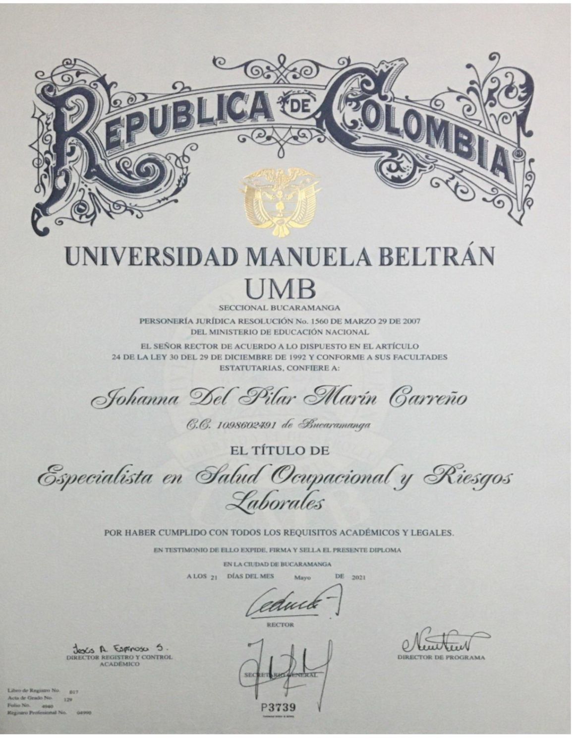 ¿Cuáles son las especialidades principales de Johanna Marin Carreño?Johanna Marin Carreño es Médico general, Médico laboral. Te mostramos algunos de los servicios que ofrece gracias a su trayectoria y su amplia experiencia: Consulta en línea, Visita medicina general.