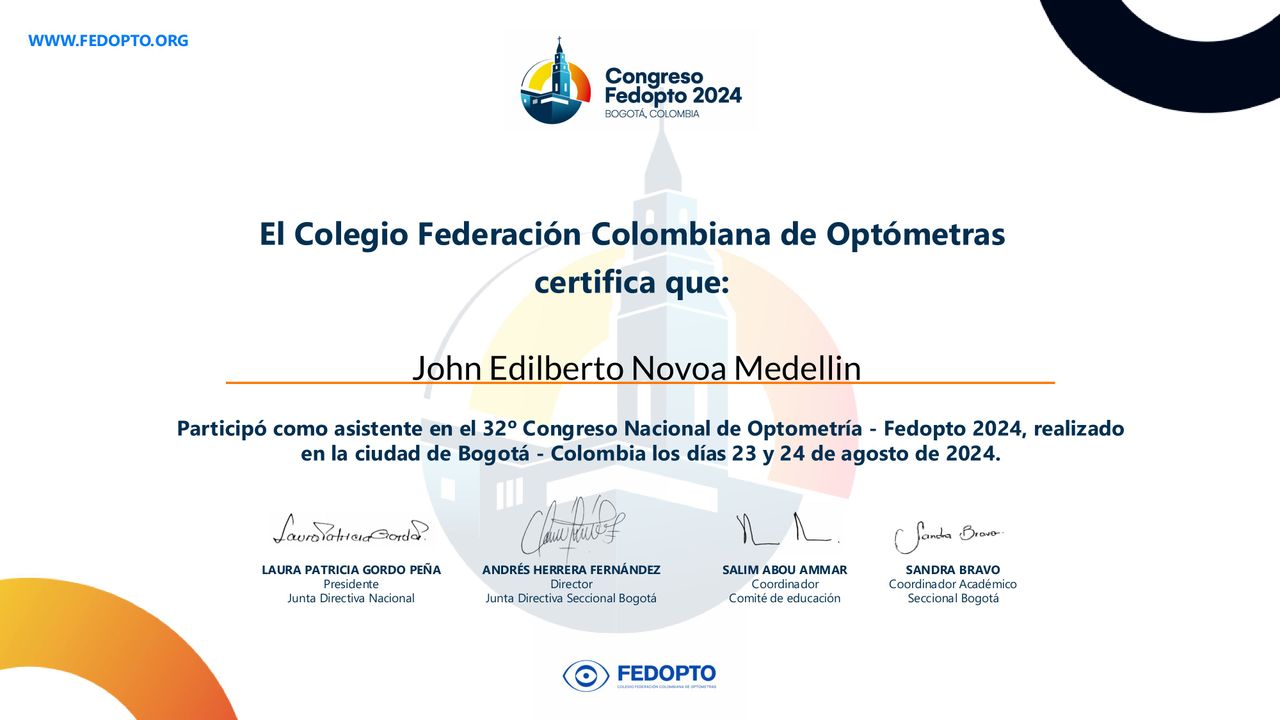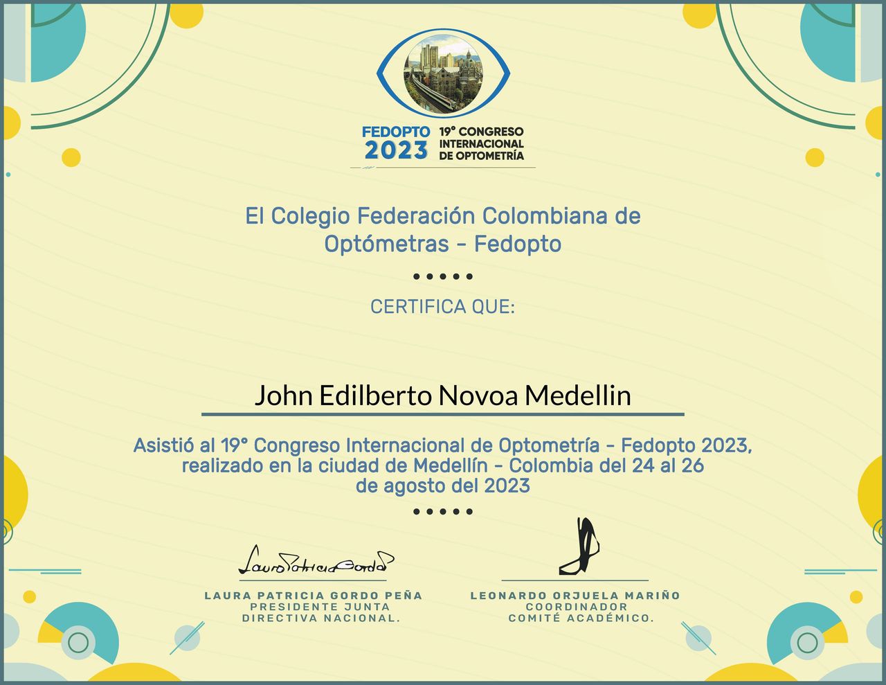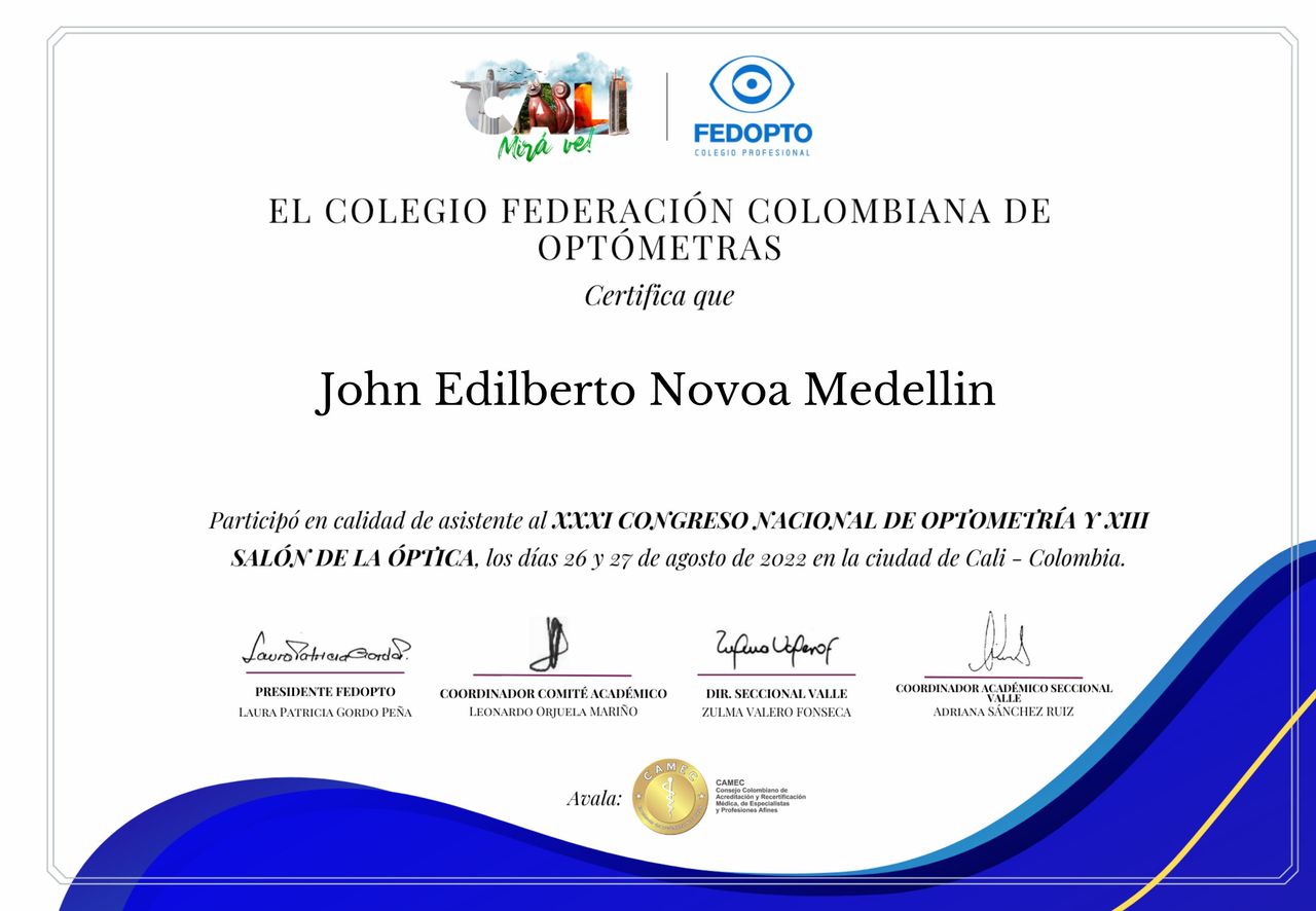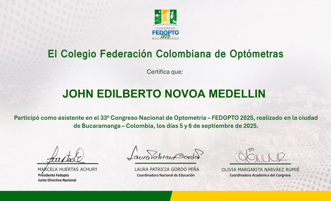 ¿Cuáles son las especialidades principales de John Novoa?John Novoa es Optómetra. Te mostramos algunos de los servicios que ofrece gracias a su trayectoria y su amplia experiencia: Control de seguimiento, Visita Optometría, Visitas sucesivas Optometría, Adaptación de lentes de contacto, Certificado visual para colegios, Certificado visual para empresas, Valoración de eficiencia visual, Análisis de lagrima y superficie ocular, Evaluación viso-perceptual, Control de miopía.