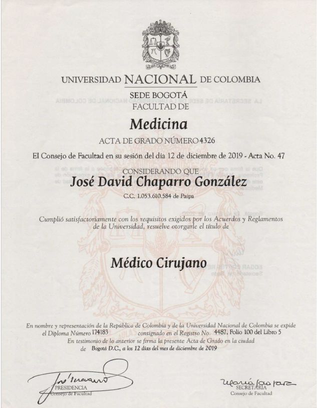 ¿Cómo puedo reservar una cita con Jose David Chaparro Gonzalez?El calendario que muestra Jose David Chaparro Gonzalez en Doctoralia está actualizado en tiempo real, por lo que solo tienes que elegir qué día y hora te convienen entre las disponibles. La reserva es gratuita y además recibes un recordatorio antes de la visita.