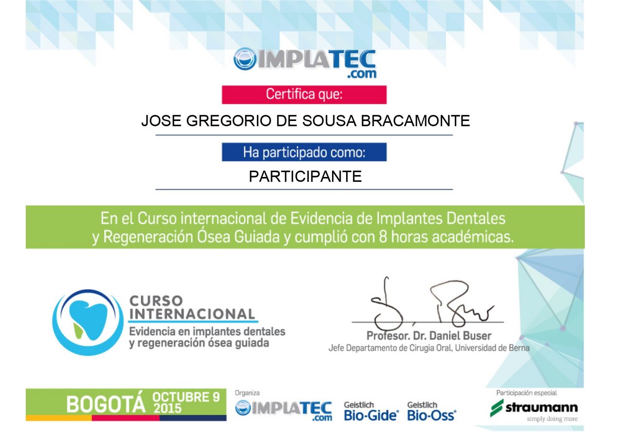¿Cuáles son las especialidades principales de Jose De Sousa Bracamonte?Jose De Sousa Bracamonte es Odontólogo. Te mostramos algunos de los servicios que ofrece gracias a su trayectoria y su amplia experiencia: Visita Odontología, Regenaración osea previa a la colocación de implantes, Tratamiento de alveolitis, Visitas sucesivas Odontología, Cirugía periodontal: colgajo abierto, Cirugía periodontal: Injerto de tejido blando, Cirugía prepotesica, Extracción dental, Implante dental, Operculectomía.