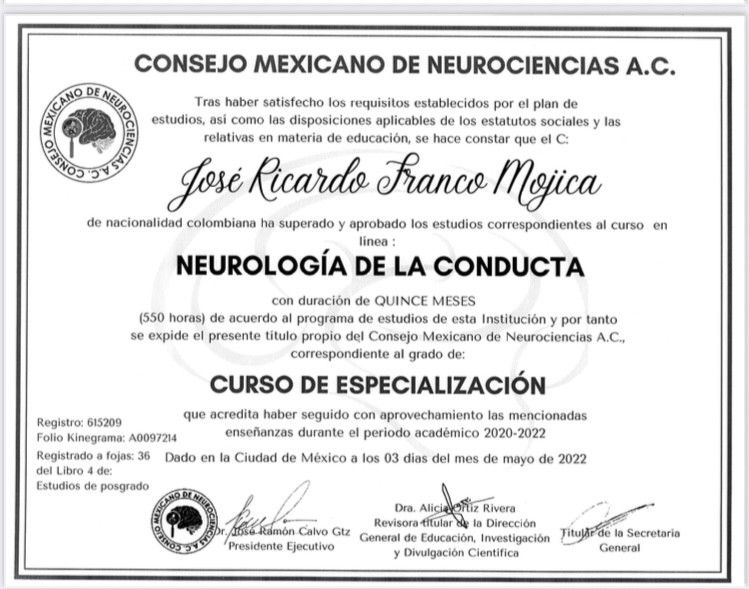 Soy José Ricardo Franco, Psicólogo, Magister en Neurología de la Conducta y con estudios de doctorado en Neurociencias.