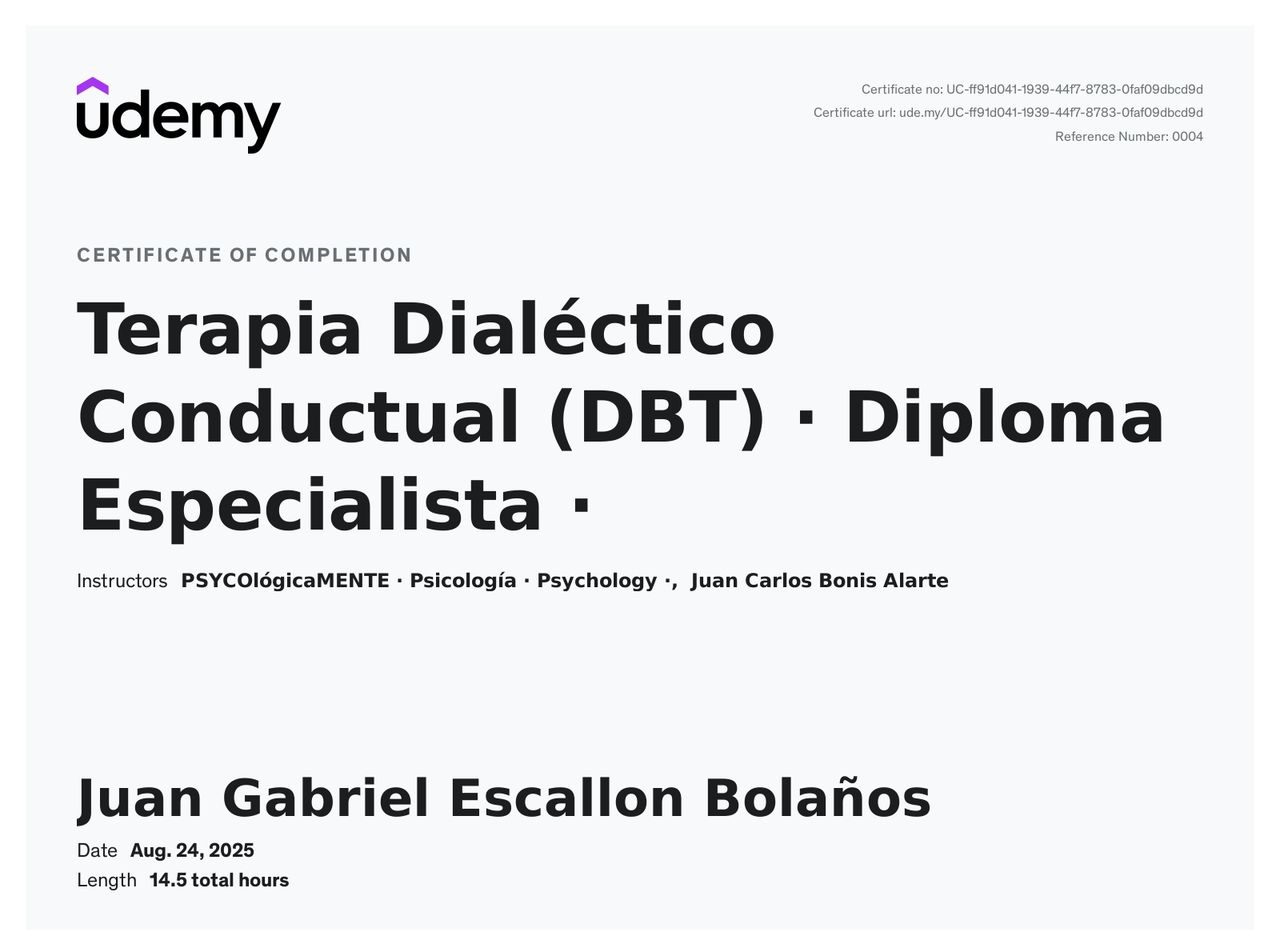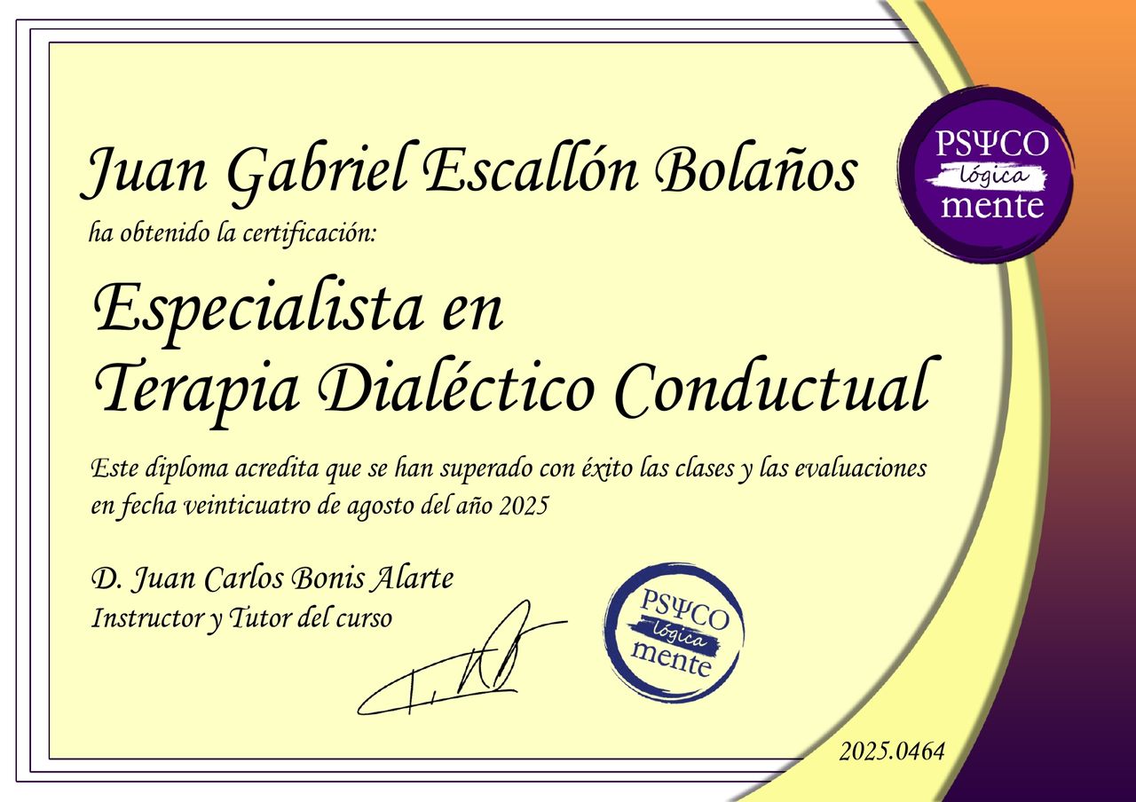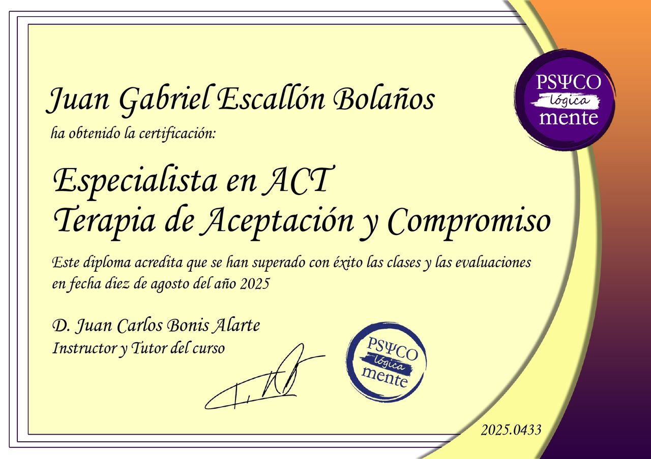 ¿Cuáles son las especialidades principales de Juan Gabriel Escallon Bolaños?Juan Gabriel Escallon Bolaños es Psicólogo. Te mostramos algunos de los servicios que ofrece gracias a su trayectoria y su amplia experiencia: Consulta psicológica por adicciones, Visita Psicología, Programación Neurolingüística (PNL), Terapia de pareja, Sesión de psicoterapia, Hipnosis terapéutica, Hipnosis clínica, Intervención grupal por adicciones, Consulta en línea, Asesoría psicológica y psicoeducación.