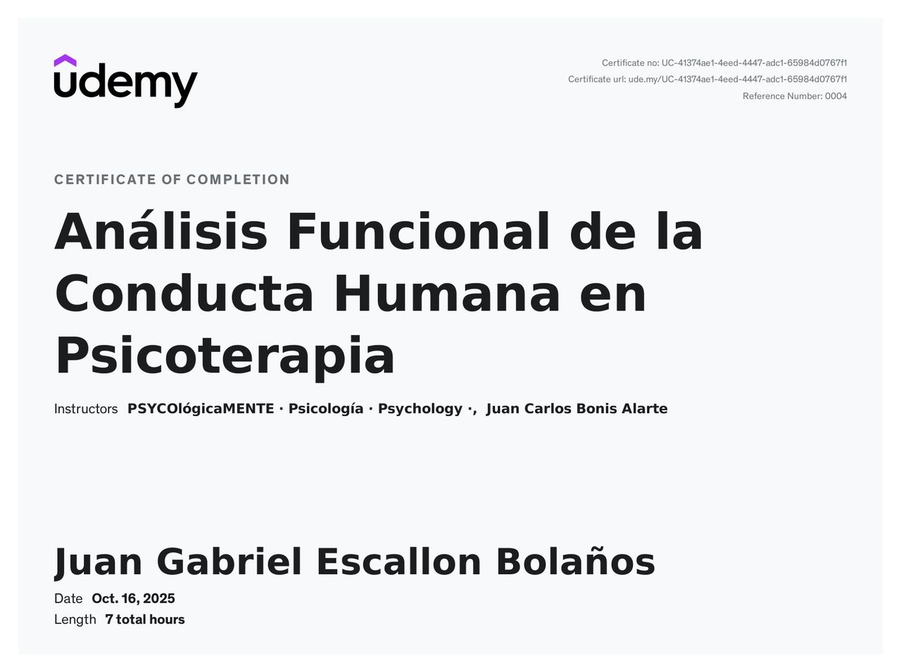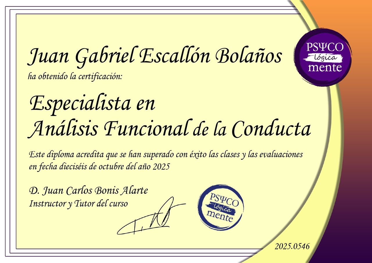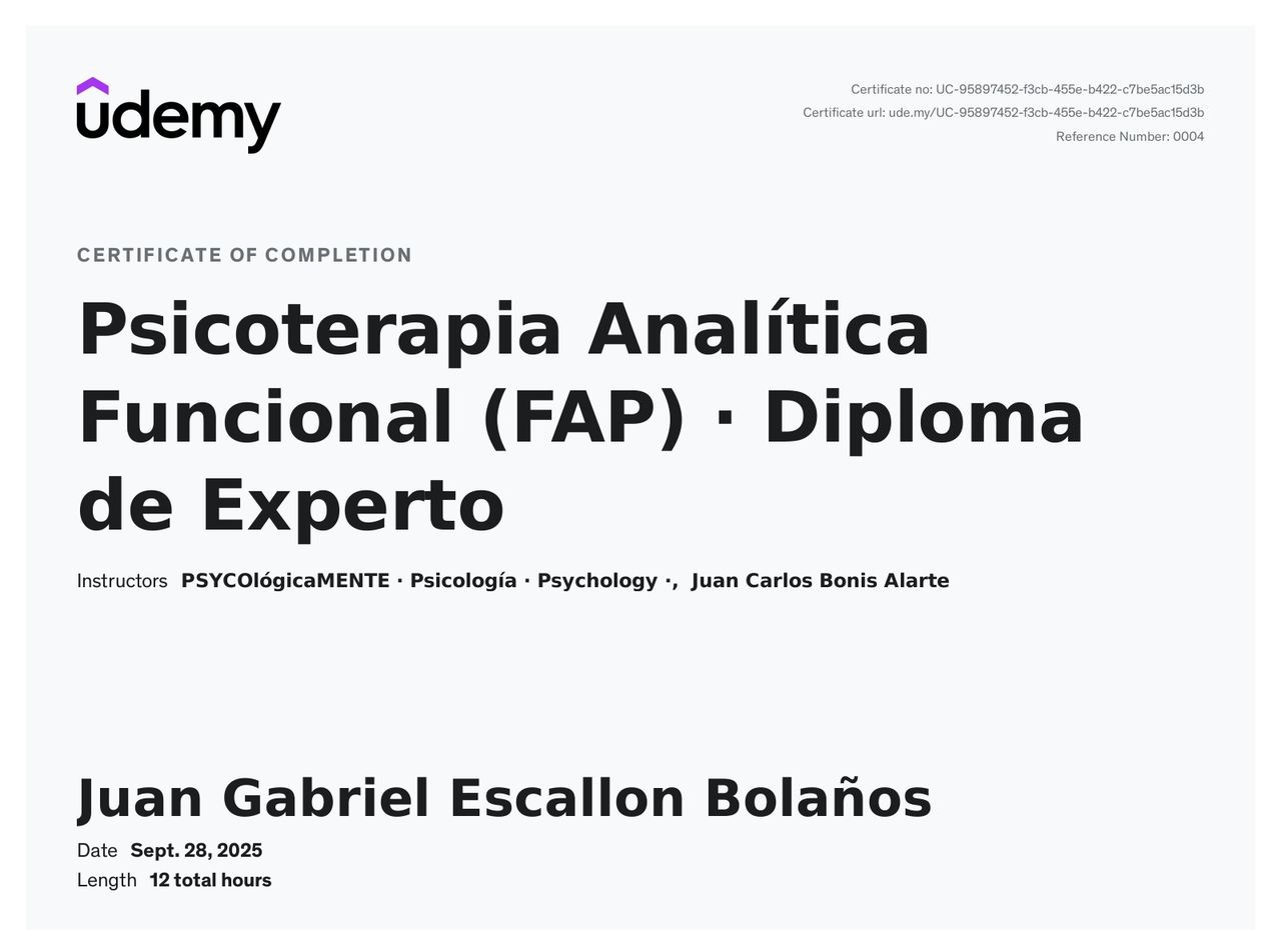 ¿Cuáles son las especialidades principales de Juan Gabriel Escallon Bolaños?Juan Gabriel Escallon Bolaños es Psicólogo. Te mostramos algunos de los servicios que ofrece gracias a su trayectoria y su amplia experiencia: Consulta psicológica por adicciones, Visita Psicología, Programación Neurolingüística (PNL), Terapia de pareja, Sesión de psicoterapia, Hipnosis terapéutica, Hipnosis clínica, Intervención grupal por adicciones, Consulta en línea, Asesoría psicológica y psicoeducación.