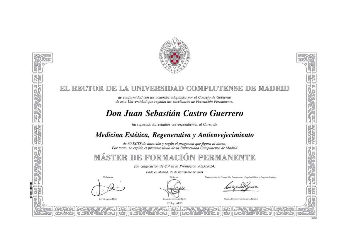 ¿Cuáles son las especialidades principales de Juan Sebastián Castro Guerrero?Juan Sebastián Castro Guerrero es Médico estético, Médico laboral. Te mostramos algunos de los servicios que ofrece gracias a su trayectoria y su amplia experiencia: Visita Medicina Estética, Tratamiento de acné, Peeling o quimioexfoliación, Rejuvenecimiento facial, Limpieza facial, Plasma Rico en Plaquetas (PRP), Manejo del estrés, Inyecciones de toxina botulínica, Infiltraciones Capilares, Sueroterapia.