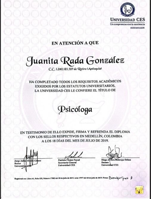 ¿Cuáles son las especialidades principales de Juanita Rada Gonzalez?Juanita Rada Gonzalez es Psicólogo. Te mostramos algunos de los servicios que ofrece gracias a su trayectoria y su amplia experiencia: Consulta por psicología, Psicoterapia Individual, Consulta psicológica evaluativa, Consulta en línea, Psicoterapia Infantil.