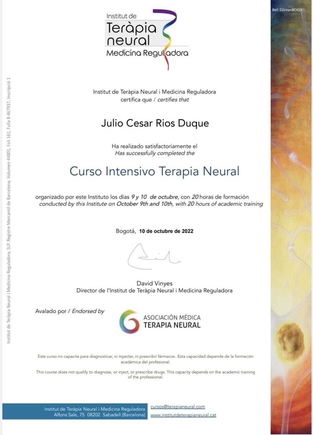 A través de una metodología directa y científica, utilizo la Terapia Neural avanzada para intervenir el sistema nervioso y eliminar los bloqueos que perpetúan el dolor y la enfermedad. Esto lo complemento con técnicas de medicina regenerativa como el Plasma Rico en Plaquetas (PRP), así como Ozonoterapia, Sueroterapia y Suplementación funcional para reducir la inflamación sistémica y optimizar la recuperación biológica desde el interior. Además, integro la Acupuntura y Electroacupuntura Médicas como una herramienta técnica de regulación orgánica que potencia la respuesta del tratamiento. Mi objetivo es claro: dejar atrás los paños de agua tibia y ofrecerle un plan médico efectivo, diseñado para recuperar su funcionalidad y devolverle la autonomía sobre su propia vida.