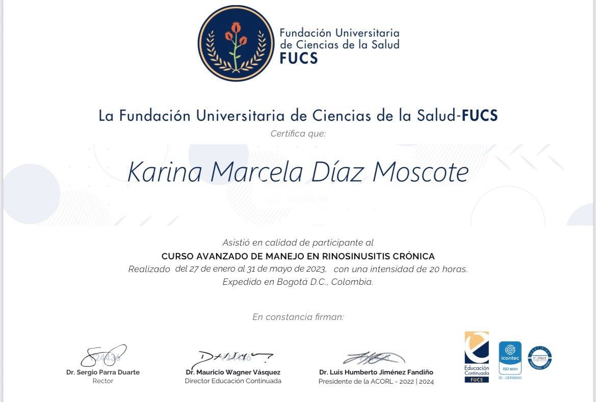 ¿Cuáles son las especialidades principales de Karina Diaz Moscote?Karina Diaz Moscote es Médico general. Te mostramos algunos de los servicios que ofrece gracias a su trayectoria y su amplia experiencia: Atención de paciente adulto, Atención de paciente pediátrico, Certificado para estudio, Certificados médicos, audición y visión, Manejo de migraña, Control de crecimiento y desarrollo, Lavado de oídos, Consulta primera vez, Consulta de medicina vestibular, Consulta en línea.
