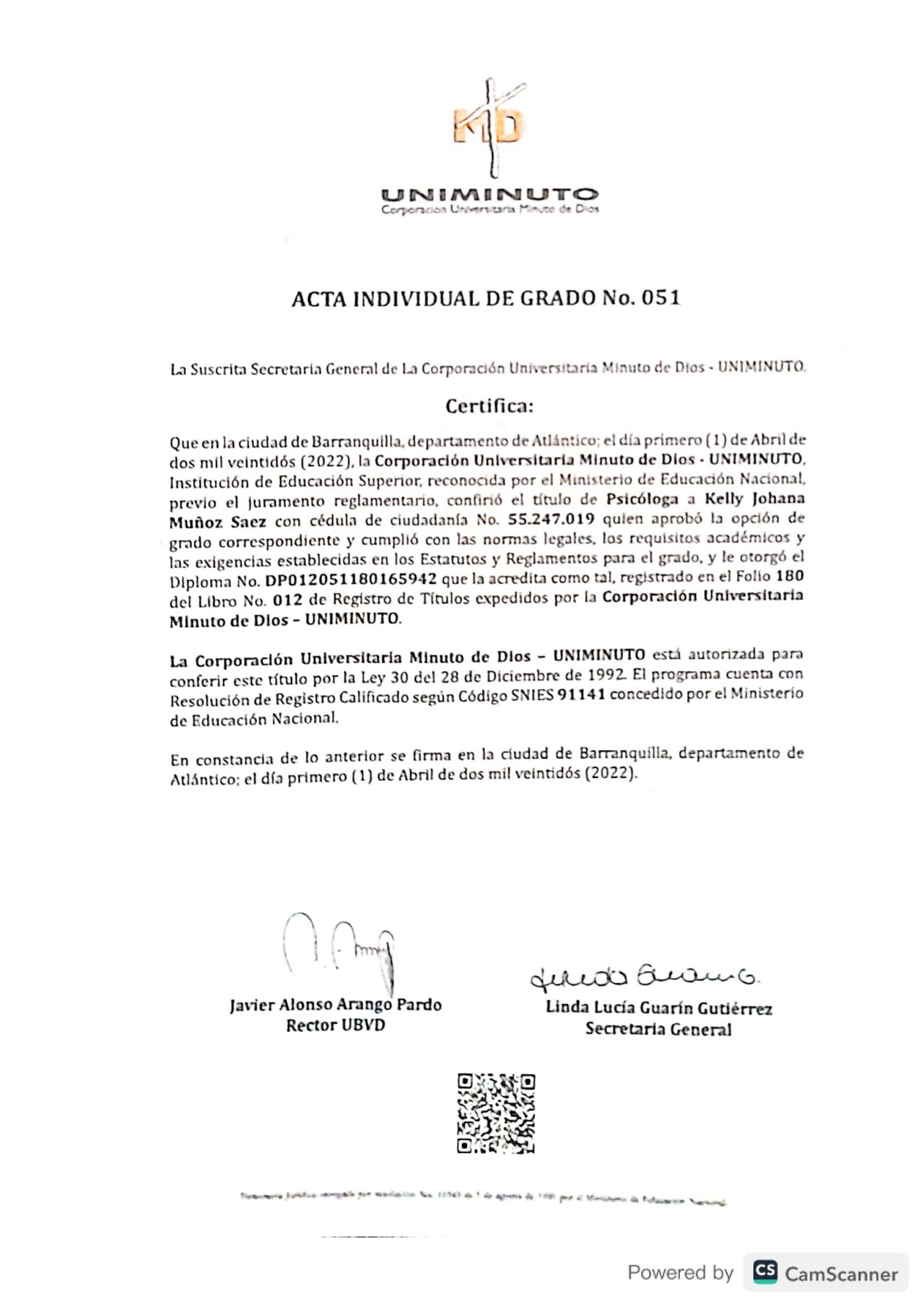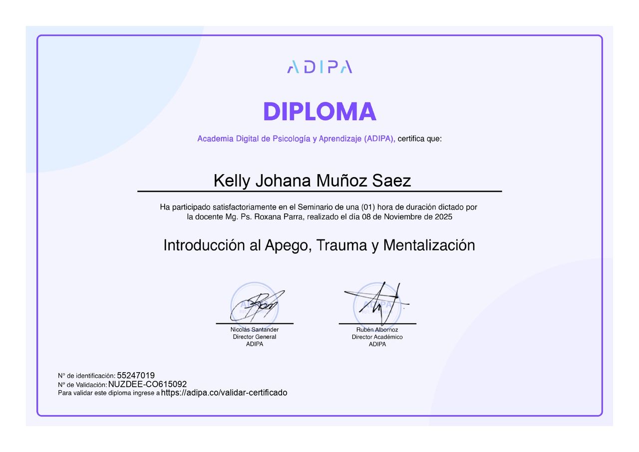 ¿Cuáles son las especialidades principales de Kelly Johana Muñoz Saez?Kelly Johana Muñoz Saez es Psicólogo. Te mostramos algunos de los servicios que ofrece gracias a su trayectoria y su amplia experiencia: Visita Psicología, Psicoterapia Individual, Asesoría psicológica y psicoeducación, Pautas de crianza, Orientación vocacional, Consulta en línea, Consulta psicológica online, Psicoterapia virtual.