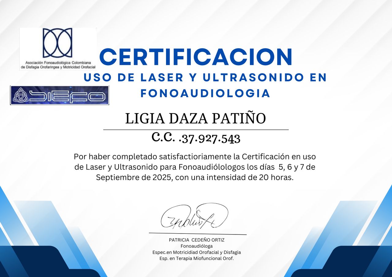Me permito expresar, con total gratitud y admiración, mi reconocimiento a la fonoaudióloga Ligia Daza Patiño, por la calidad humana, profesionalismo e idoneidad demostrados durante el proceso de valoración con mi niño.