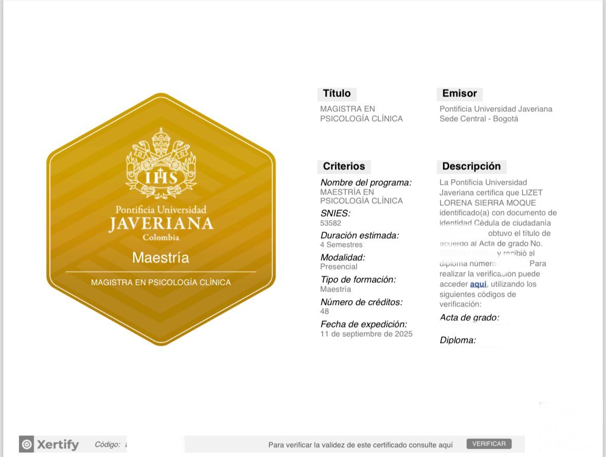 Si buscas una profesional organizada, que se esfuerza por preparar las sesiones, fortalecer sus conocimientos y tener muy presente el criterio ético y clínico, te recomiendo a Lorena.