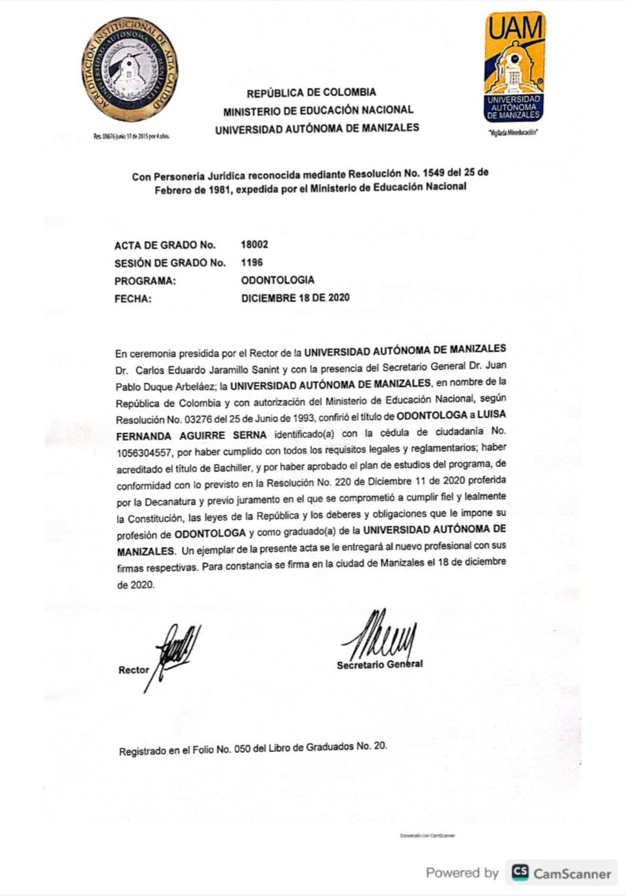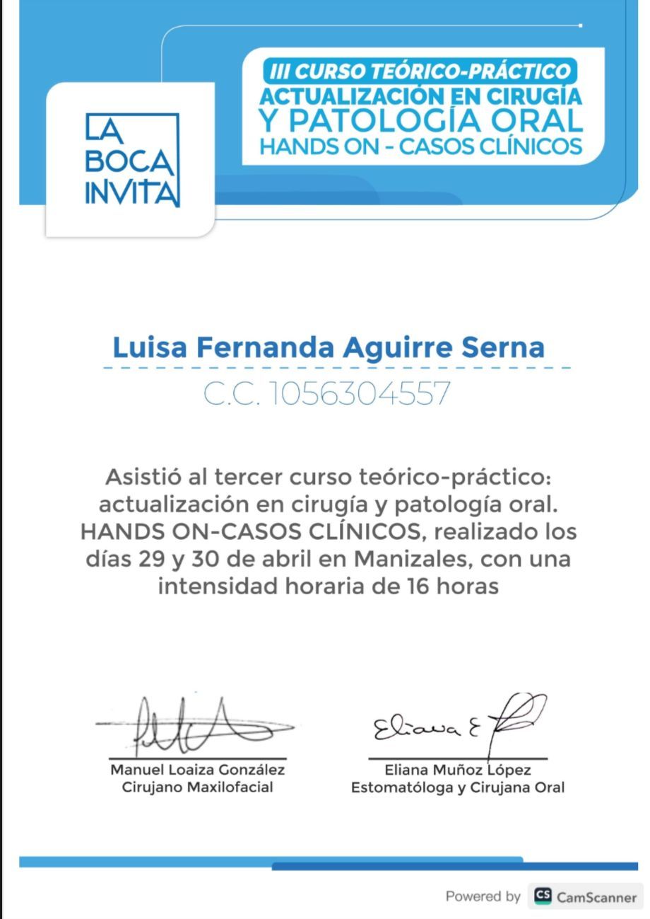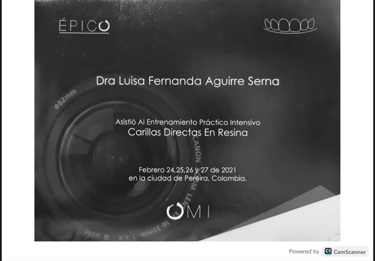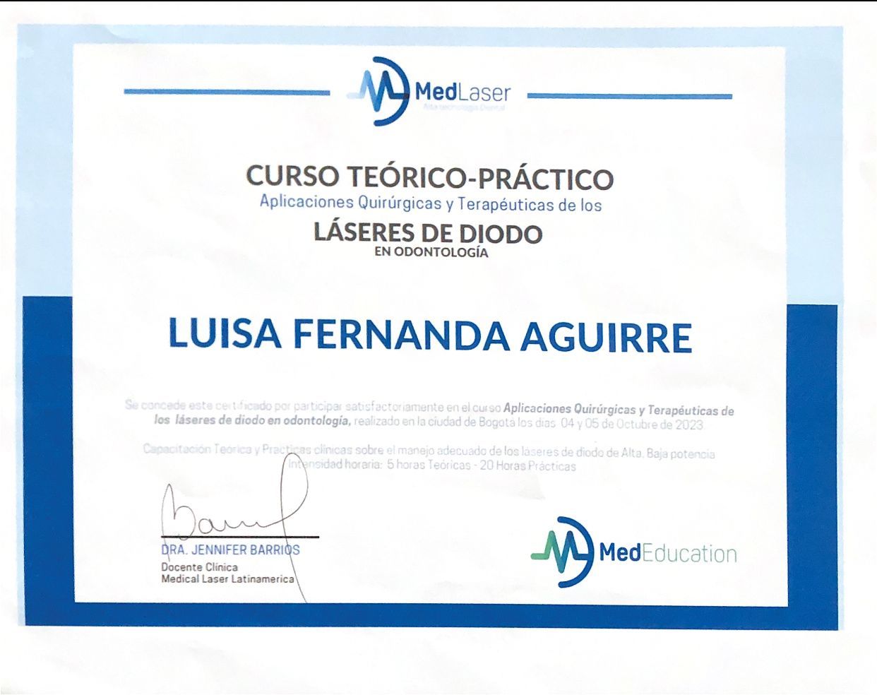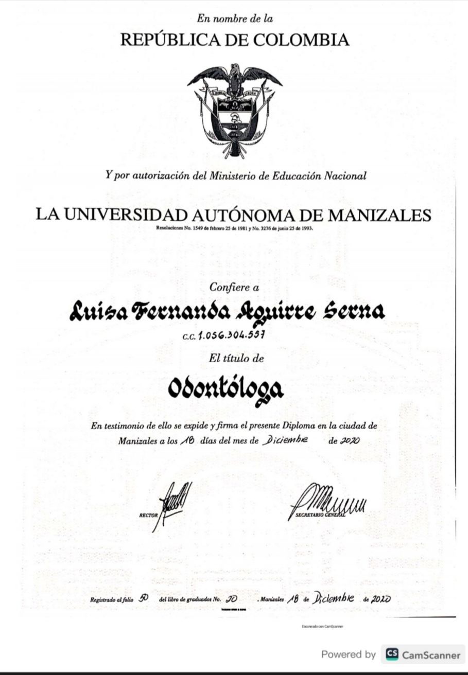 ¿Cuáles son las especialidades principales de Luisa Fernanda Aguirre Serna?Luisa Fernanda Aguirre Serna es Odontólogo. Te mostramos algunos de los servicios que ofrece gracias a su trayectoria y su amplia experiencia: Visita Odontología, Aclaramiento - blanqueamiento dental, Mantenimiento bordes incisales, Restauración de caries, Restauración borde completo y angulo, Rehabilitación Oral, Protesis fija, Placas miorelajantes, Botox bruxismo, Odontología Estética (resinas).