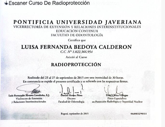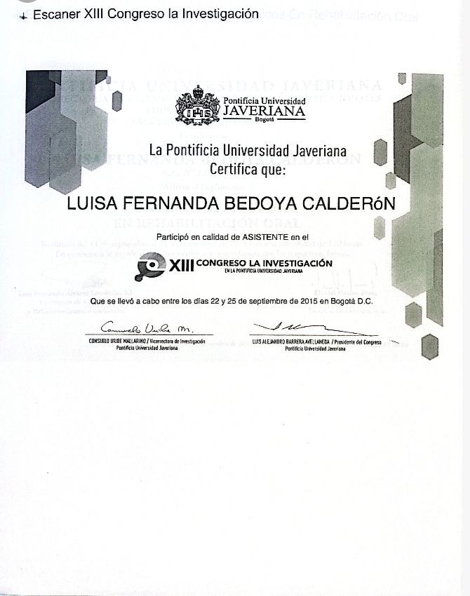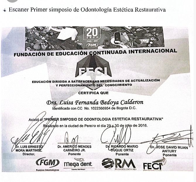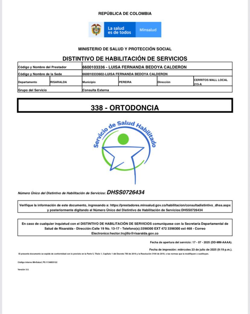 ¿Cuáles son las especialidades principales de Luisa Fernanda Bedoya Calderón?Luisa Fernanda Bedoya Calderón es Odontólogo, Ortodoncista. Te mostramos algunos de los servicios que ofrece gracias a su trayectoria y su amplia experiencia: Visita Odontología, Ortodoncia, Ortodoncia invisible clear Aligner, Control Ortodoncia, Retenedores ortodoncia, Odontología Estética (resinas), Consulta Odontología.
